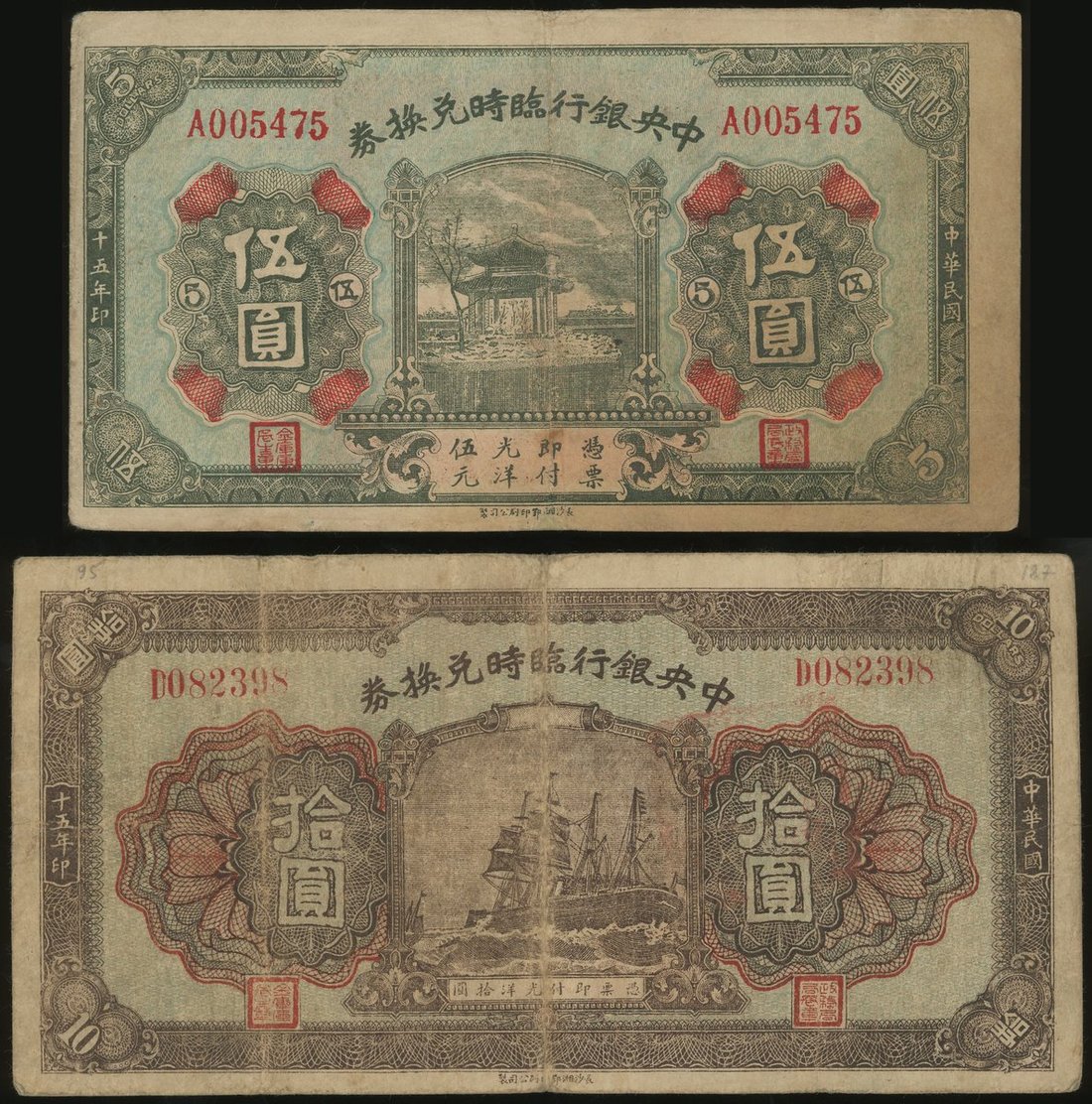 1926年中央銀行臨時兌換劵5元及10元,編號A005475及D082398,前者右邊有黃,後者有明顯中間摺痕,AVF,較少見的良好品相