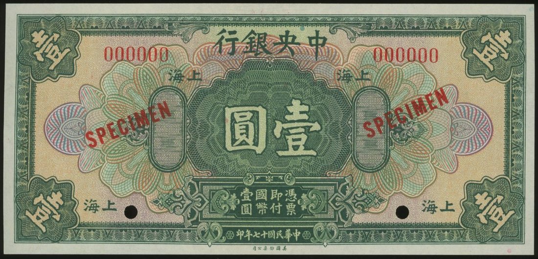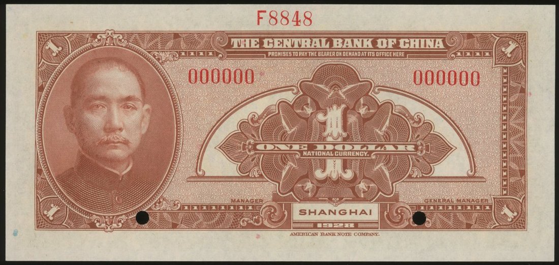 The Central Bank of China, $1 specimen, Shanghai, 1928, control number F8848, green, printed by ABNC, punch hole cancelled,