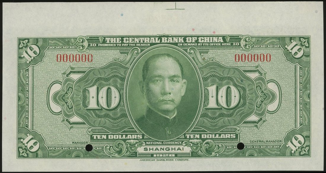 The Central Bank of China, $10 specimen, Shanghai, 1928, control number F8639, blue, green and pale orange, printed by ABNC, punch hole cancelled,