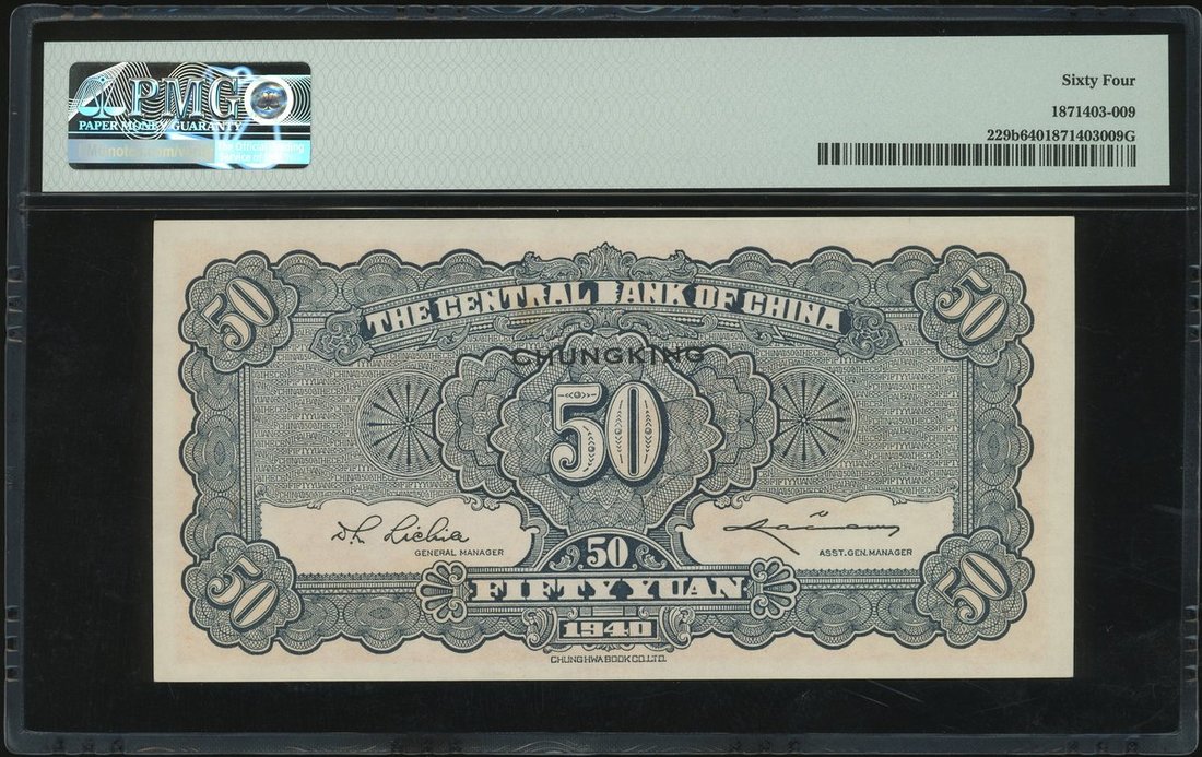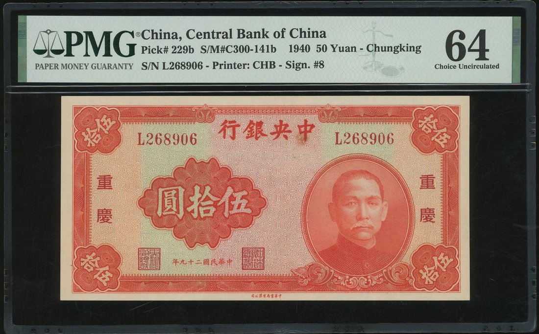 1940年中央銀行50元,重慶地名,編號L268906,中華書局版,PMG 64,上方有輕微污漬