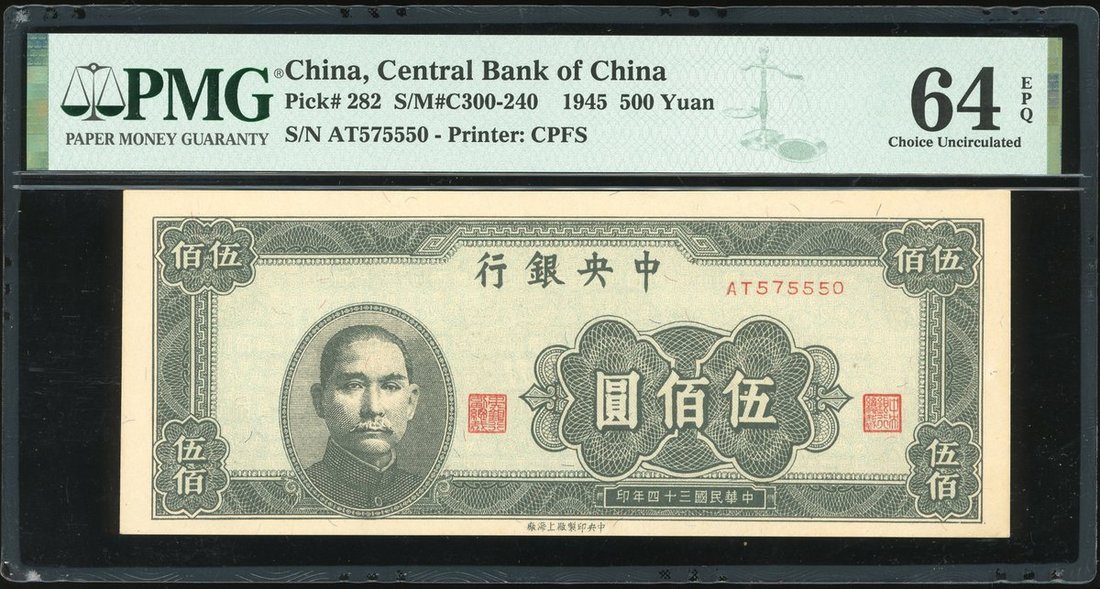 1945年中央銀行500元,編號AT575550,PMG 64EPQ