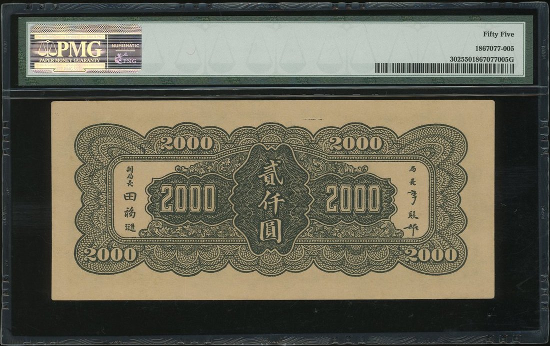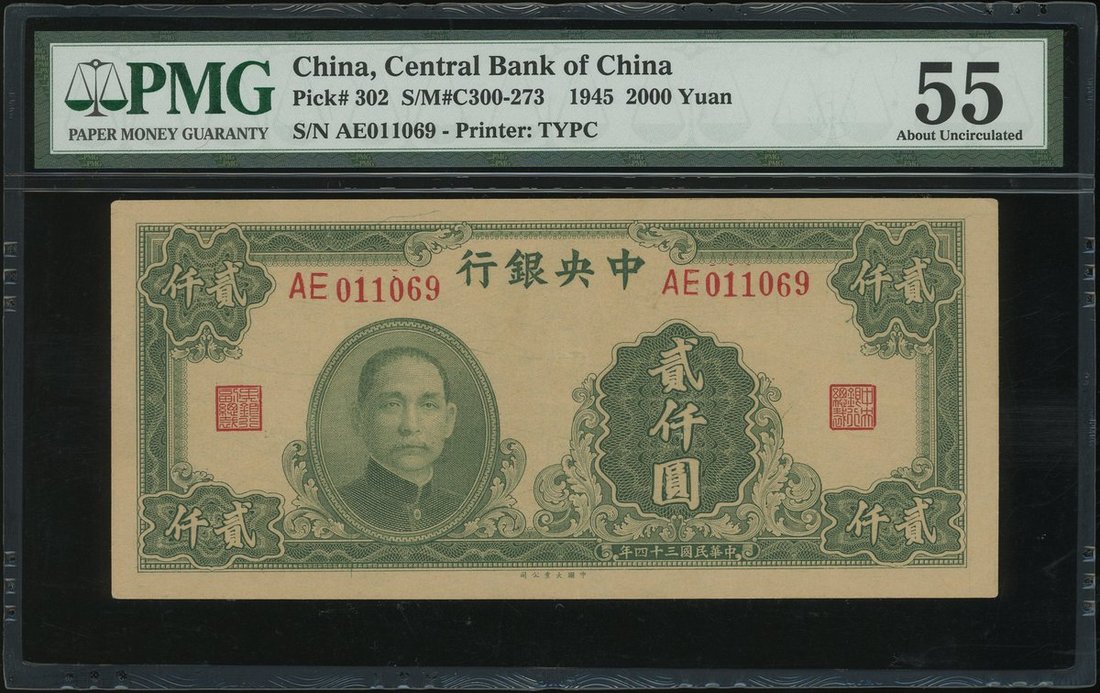 1945年中央銀行2000元,大業版,編號AE011069,PMG55