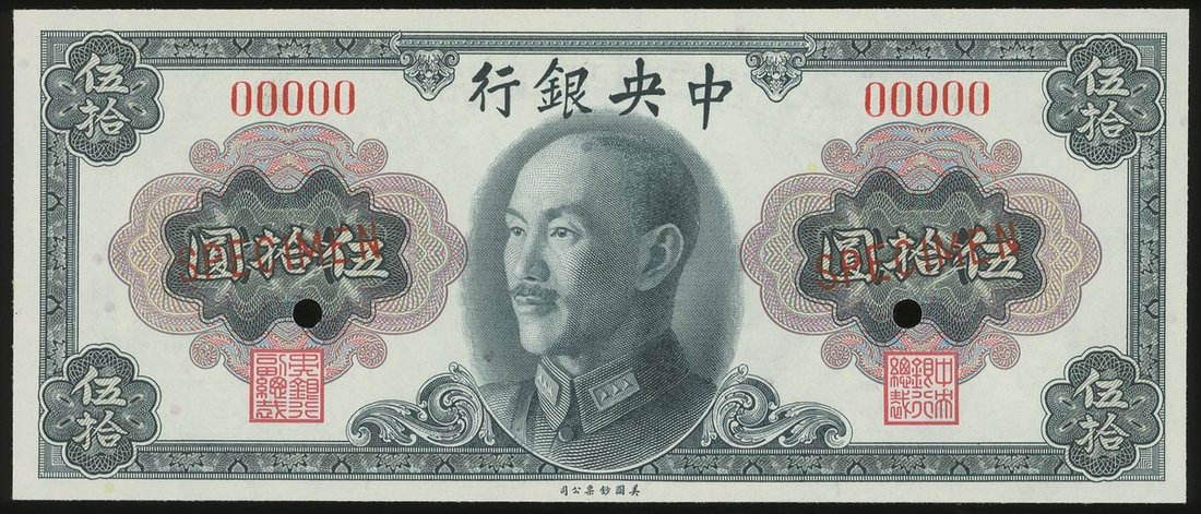 1945年中央銀行金元券50元樣票,美鈔版, 蔣介石像,打孔注銷,UNC品相