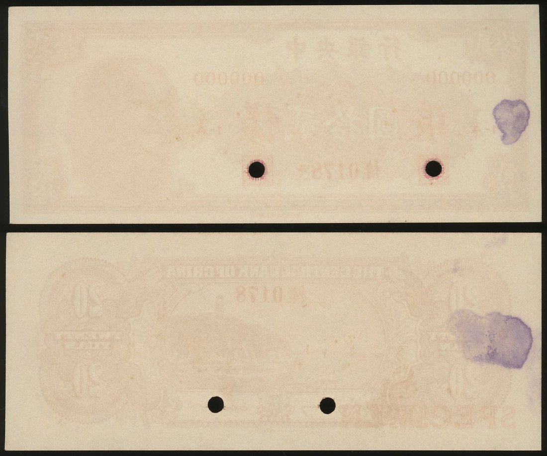 1948年中央銀行20元正反面樣票,編號1-A 000000,AU,有貼痕