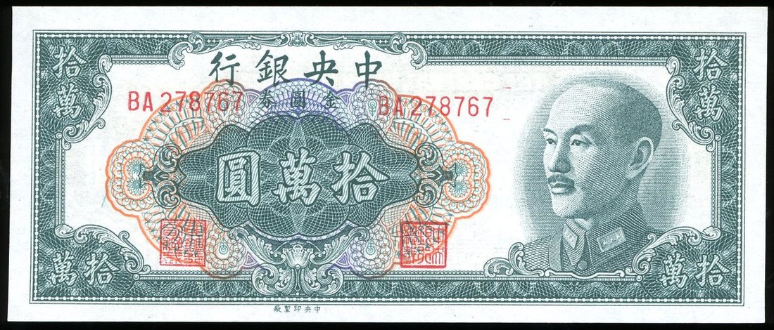 1949年中央銀行金圓券10萬元,編號BA278767,AU品相