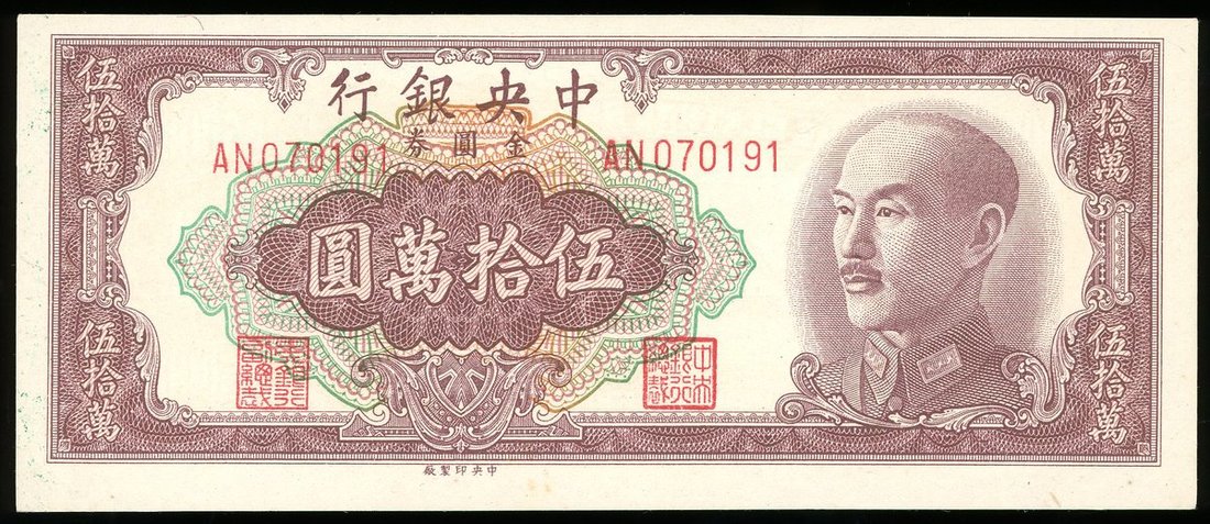 1949年中央銀行金圓券50萬元,編號AN070191,AU