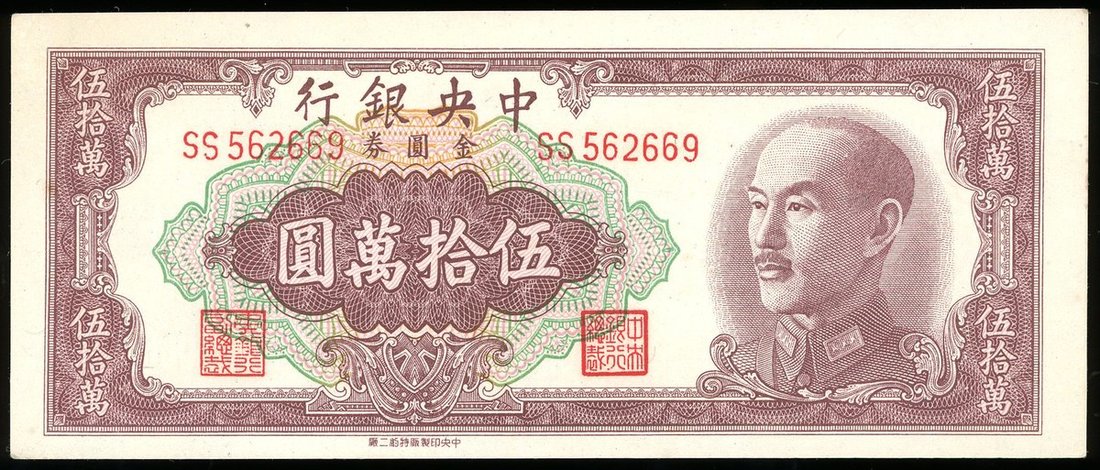 1949年中央銀行金圓券50萬元,編號SS562669,AU