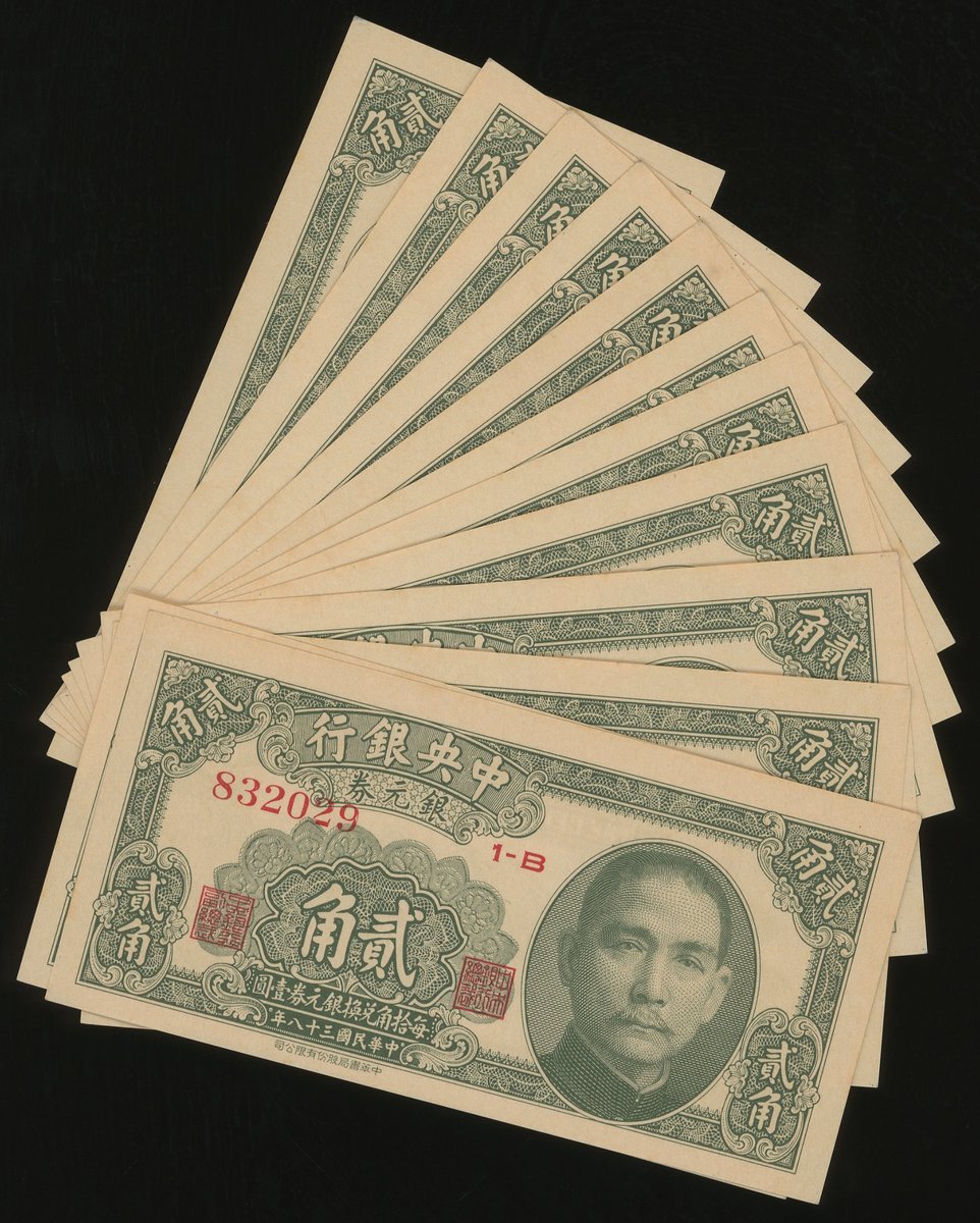 1949年中央銀行銀元券2角12枚一組,連號832029-832040,UNC品相,輕微有黃