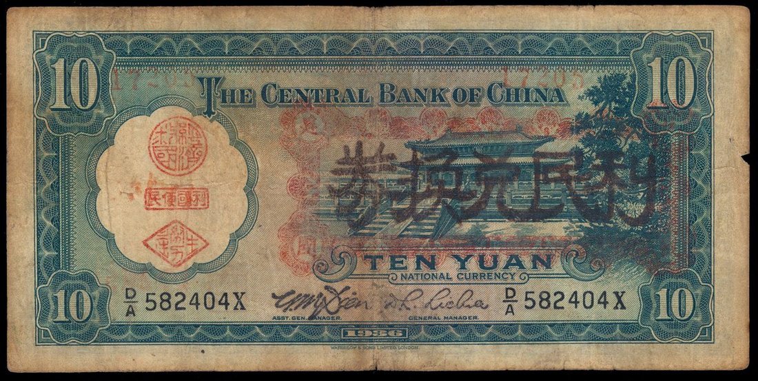 Central Bank of China, 10 yuan, wartime propaganda note, 'Li Min Dui Huan Quan' overprinted on reverse, also red chop marks, crude serial number 47205 on obverse,