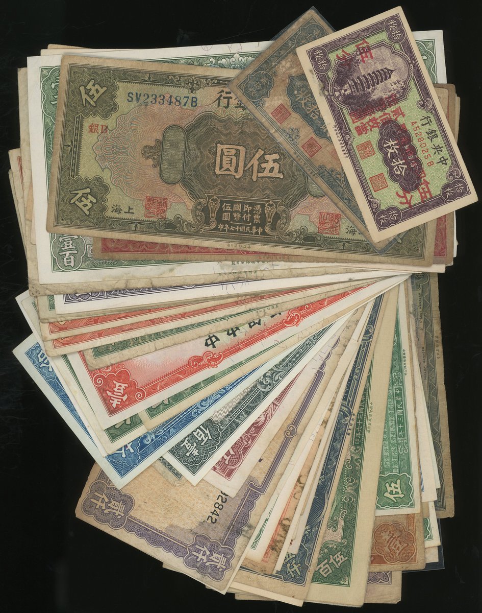 Central Bank of China, group of 59 notes, including the scarcer 1928 5 yuan, Shanghai and 1 yuan, 1935 oveprinted on Agricultural and Industrial Bank of China, 100 yuan, 1936, Canton Municipal Bank $1, 1933 and Russian Militray Money 100 yuna, 1945,