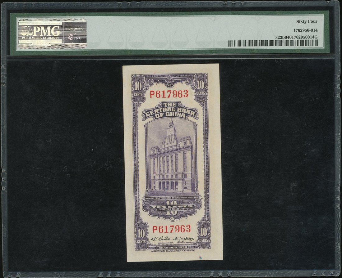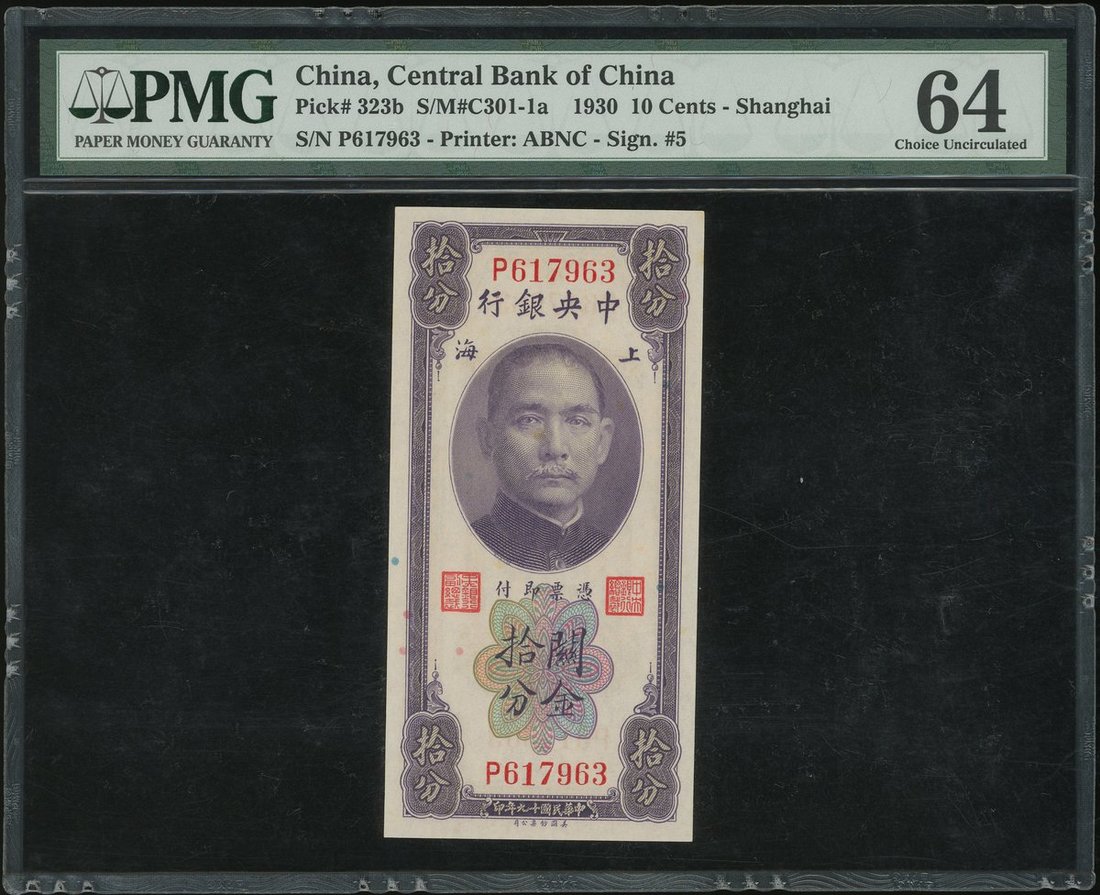 The Central Bank of China, 10 fen Customs Gold Unit, Shanghai, 1930, serial number P617963, (Pick 323b), PMG 64 Choice Uncirculated