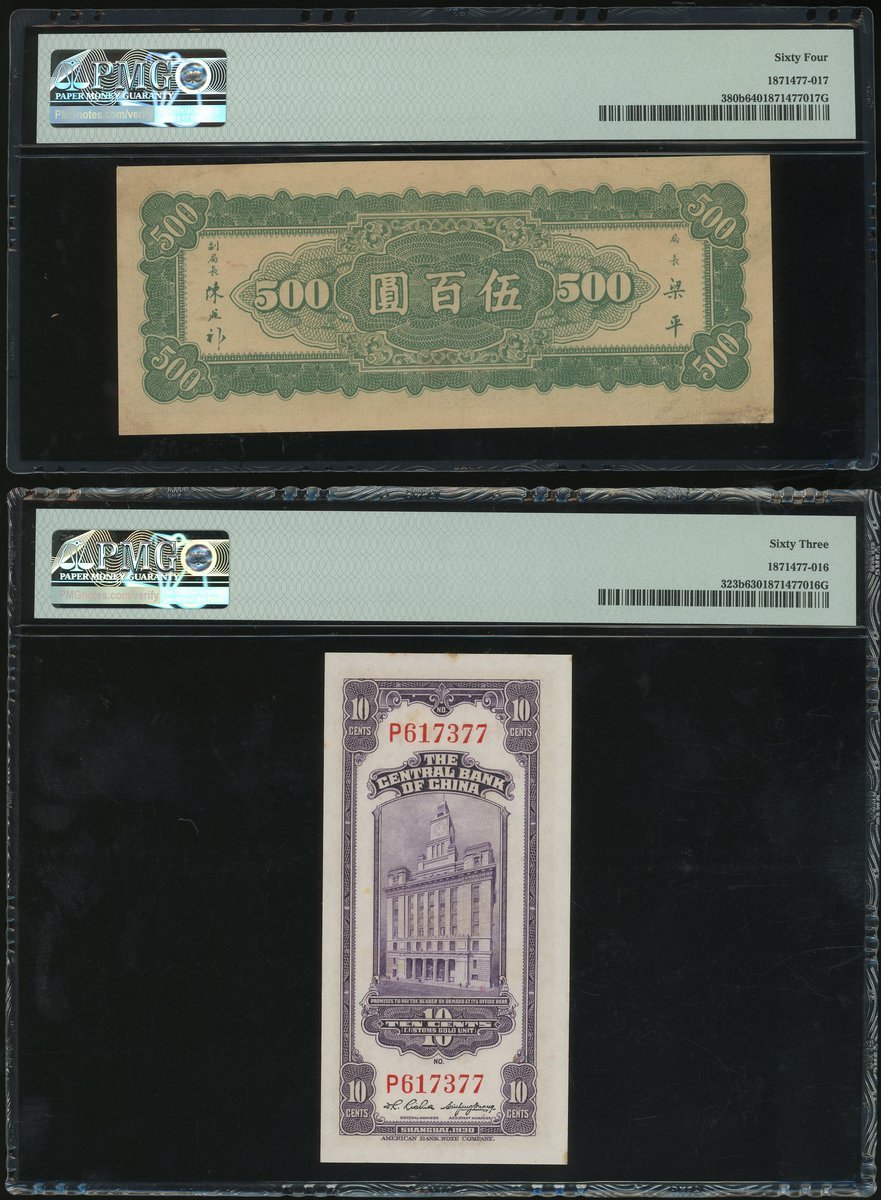 Central Bank of China, 10 cents Customs Gold Unit and 500 yuan, 1930 and 1947, serial number P617377, NF352646, (Pick 323b, 380b), PMG 63 and 64, choice uncirculated.(2)