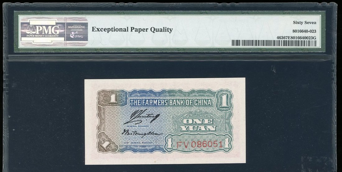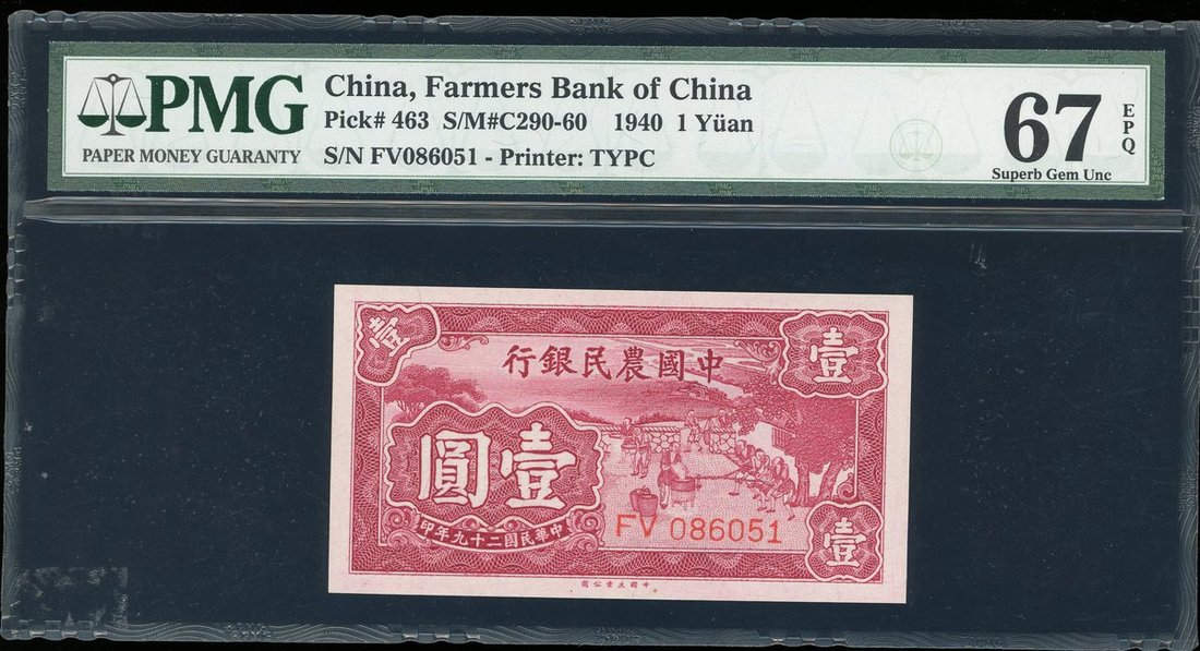 The Farmers Bank of China, 1 Yuan, 1940, serial number FV086051, (Pick 463), PMG 67EPQ Superb Gem Uncirculated