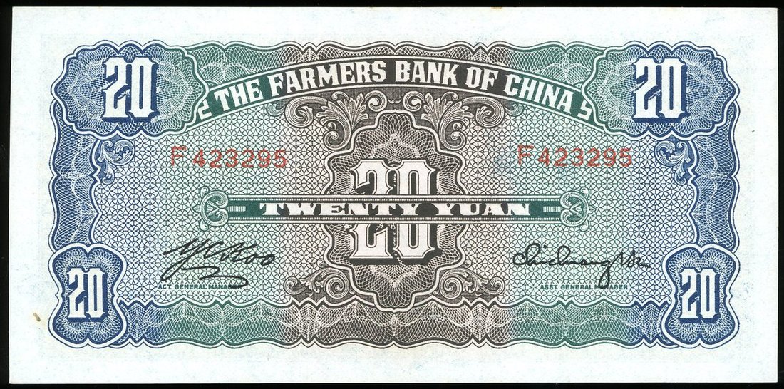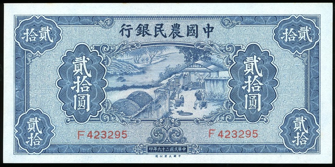 1940年中國農民銀行20元,編號F423295,UNC品相,微漬