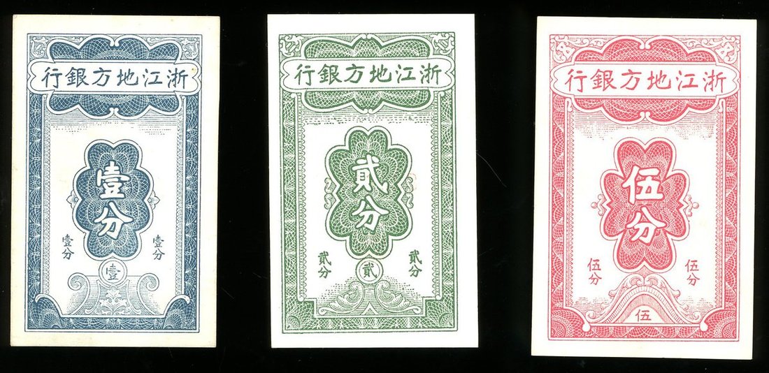 Chekiang Provincial Bank, 1, 2 and 5 fen, ND (1938), vertical format, blue, green and red respectively,