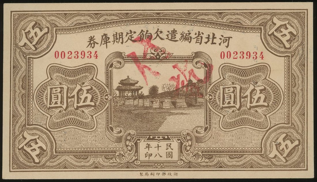 Hopei Province, 5 yuan, 1929, serial number 0023934, brown, pavilion at centre, red stamp in Chinese characters 'PAID' on obverse,