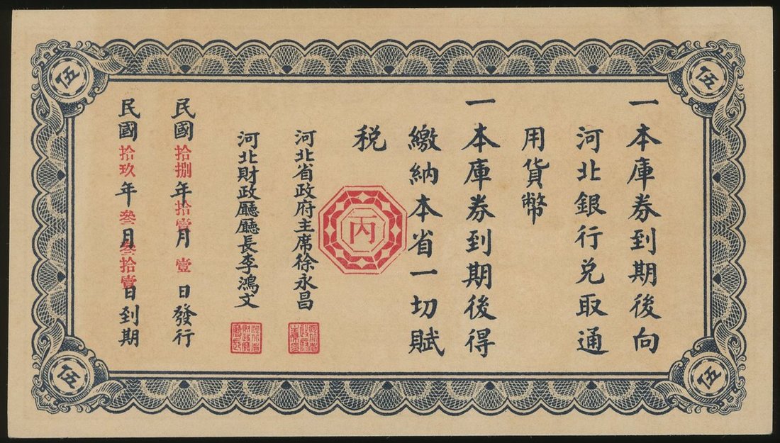 1929年河北省編遣欠餇定期庫券5元,編號0023934,加蓋付訖,UNC品相,少見