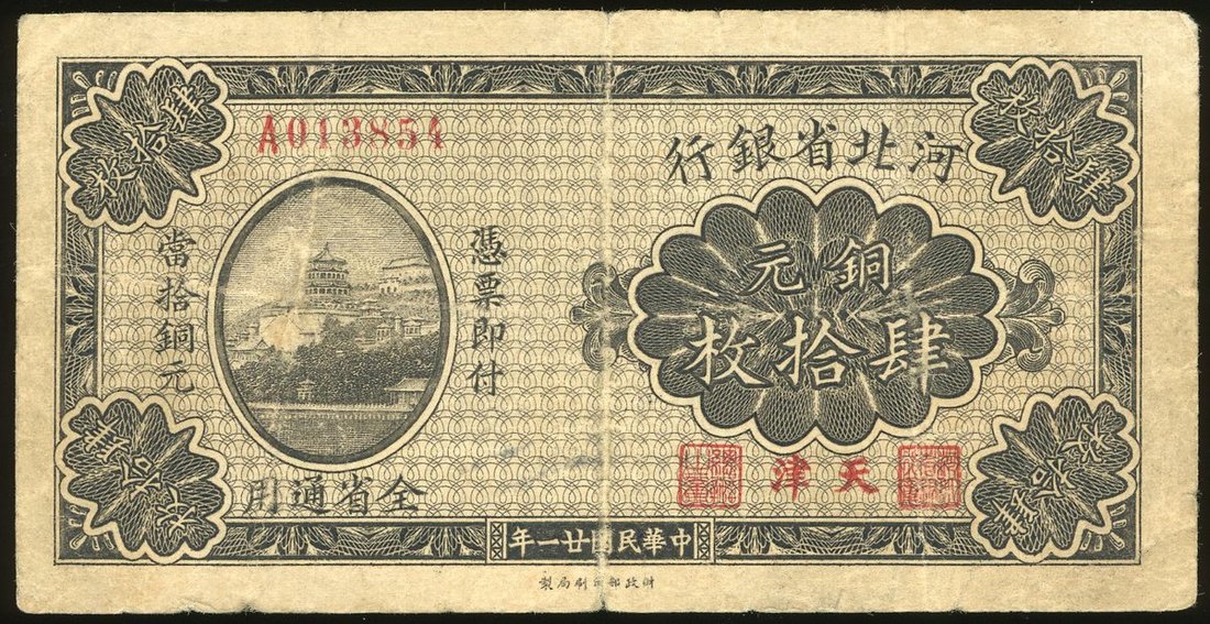 Provincial Bank of Hopei, 40 coppers, Tientsin, 1932, serial number A013854, (Pick S1718), fine