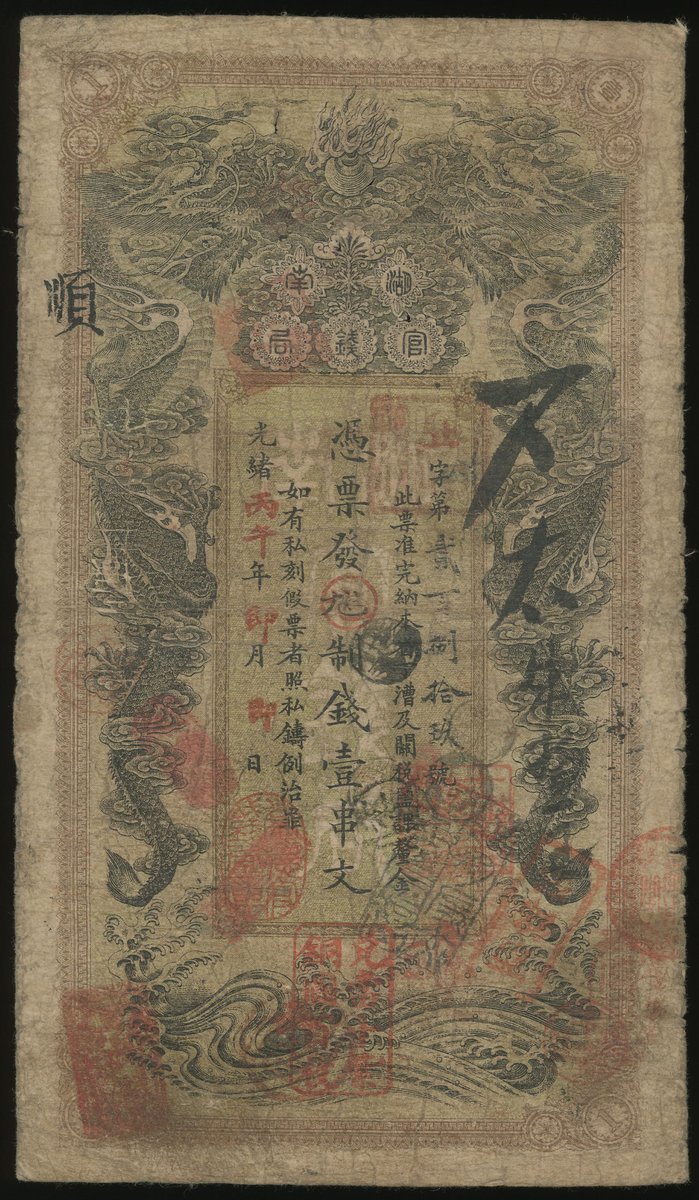 Hunan Government Bank, 1 chuan, Year 'Bingwu' of Guangxu(1906), serial number 2189, vertical format, facing dragons at upper left and right,
