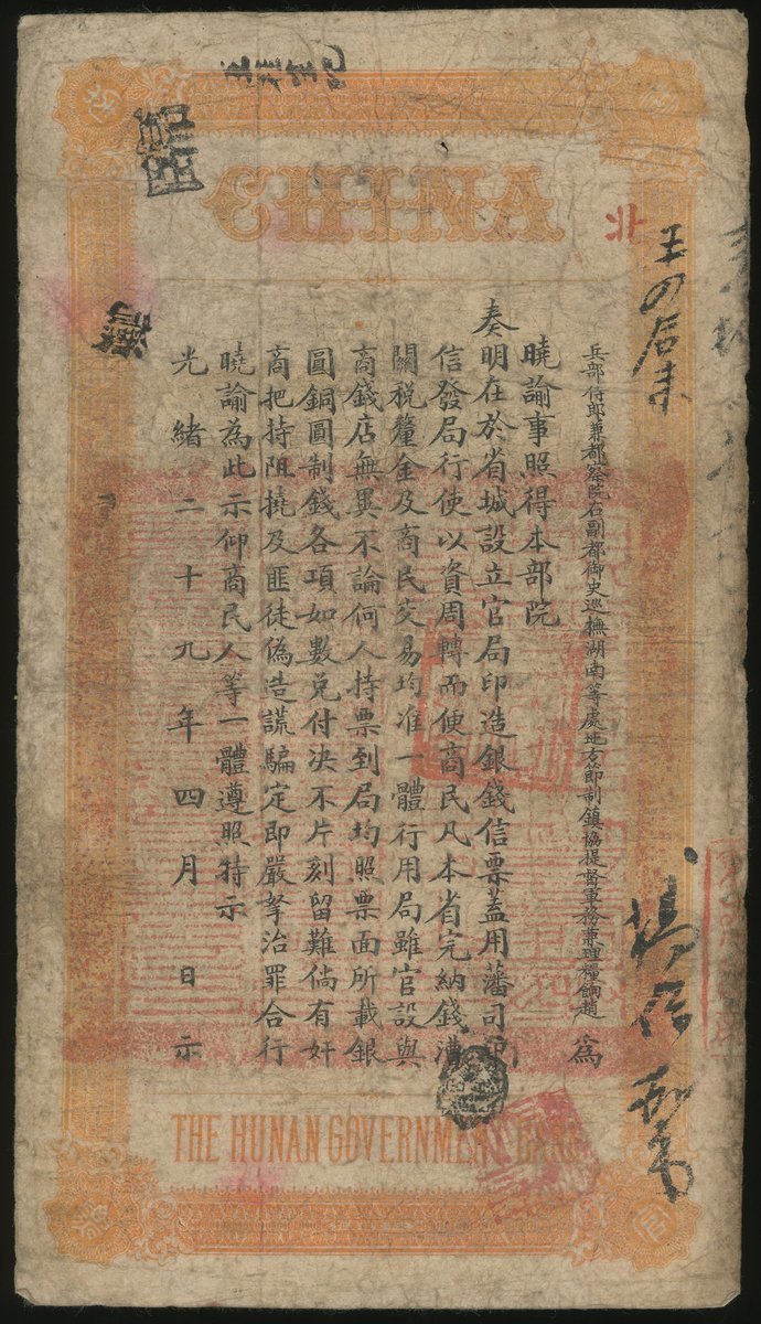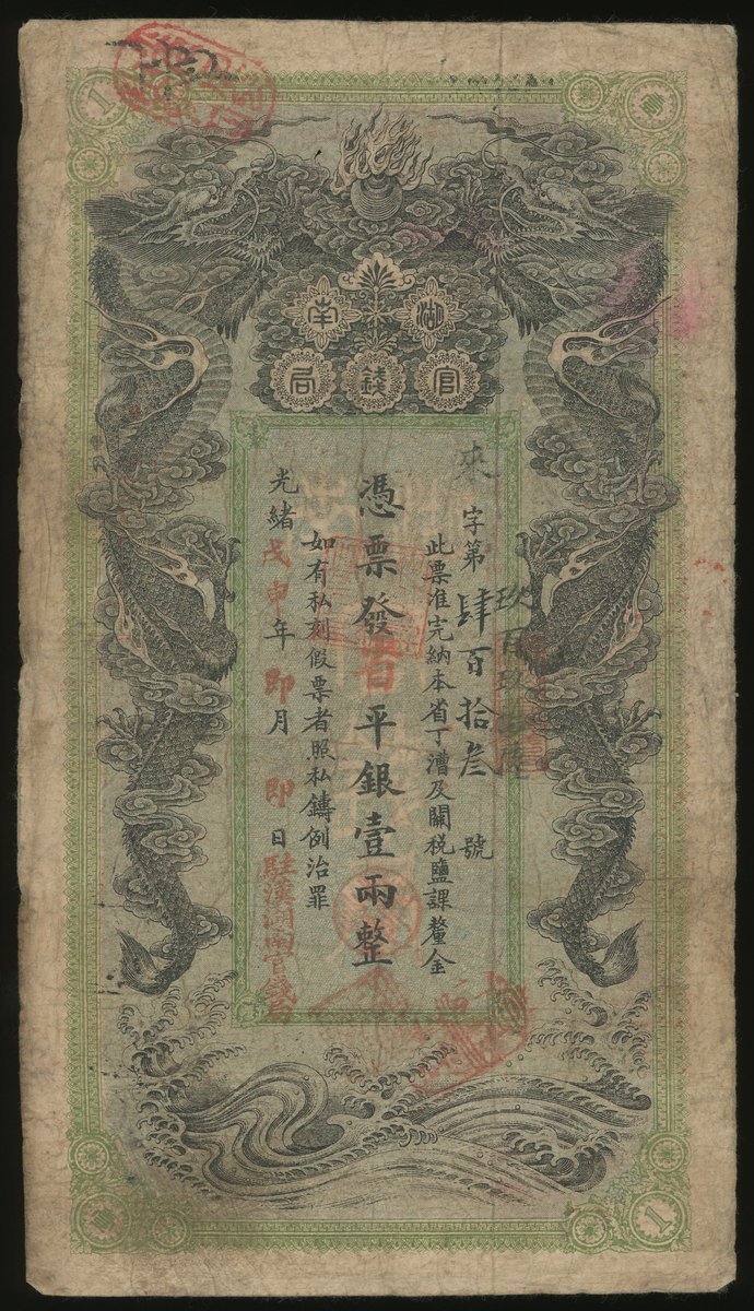 光緒戊申年(1908)年湖南官錢局1兩,編號413,GF,有細孔,正反面均有多個蓋印,邊有損
