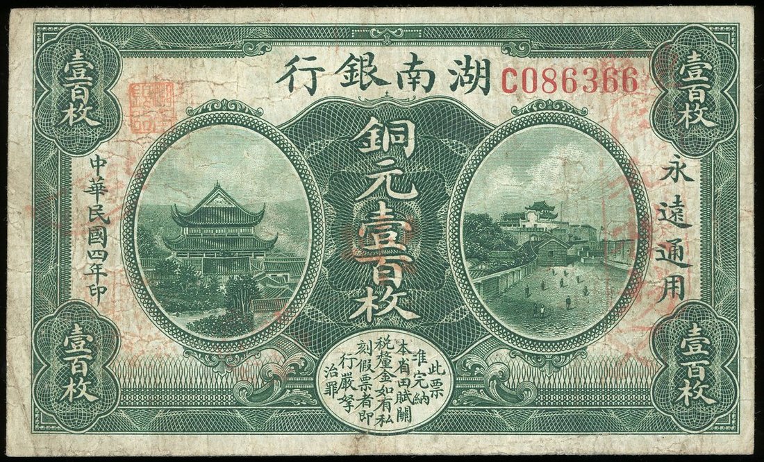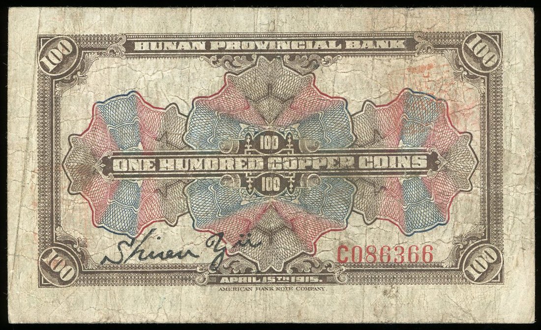 Hunan Provincial Bank, 100 coppers, 1915, serial number C086366, (Pick S2050), very fine