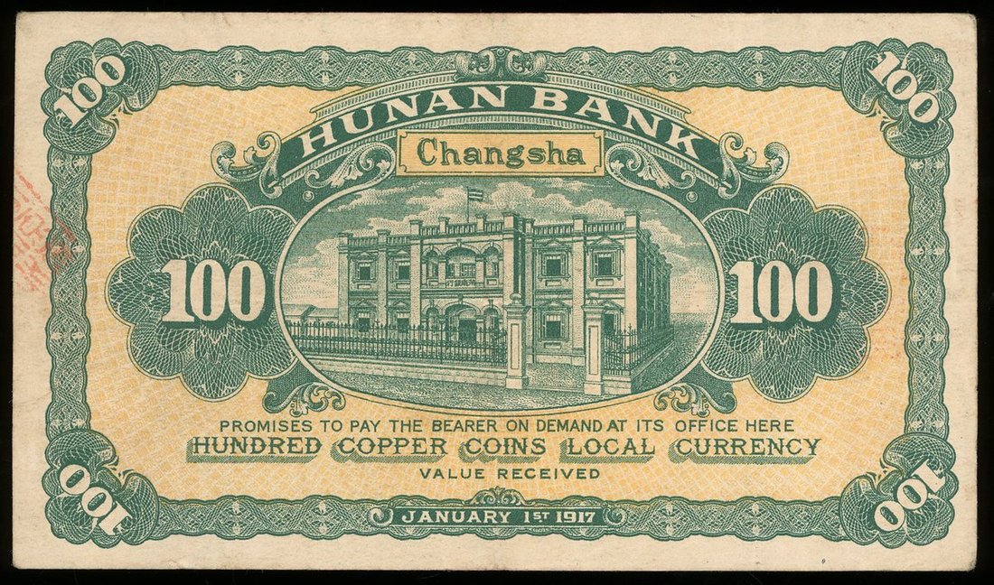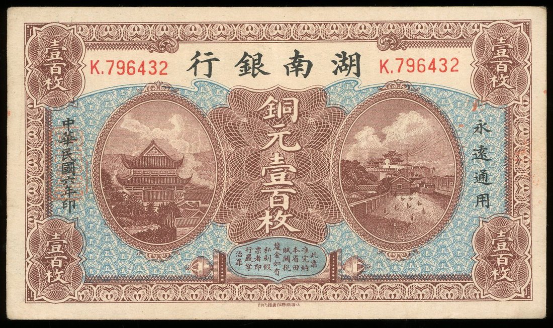 Hunan Bank, 100 copper, Changsha, 1917, serial number K. 796432, purple-brown and blue, Chinese house at left, Great Wall at right,