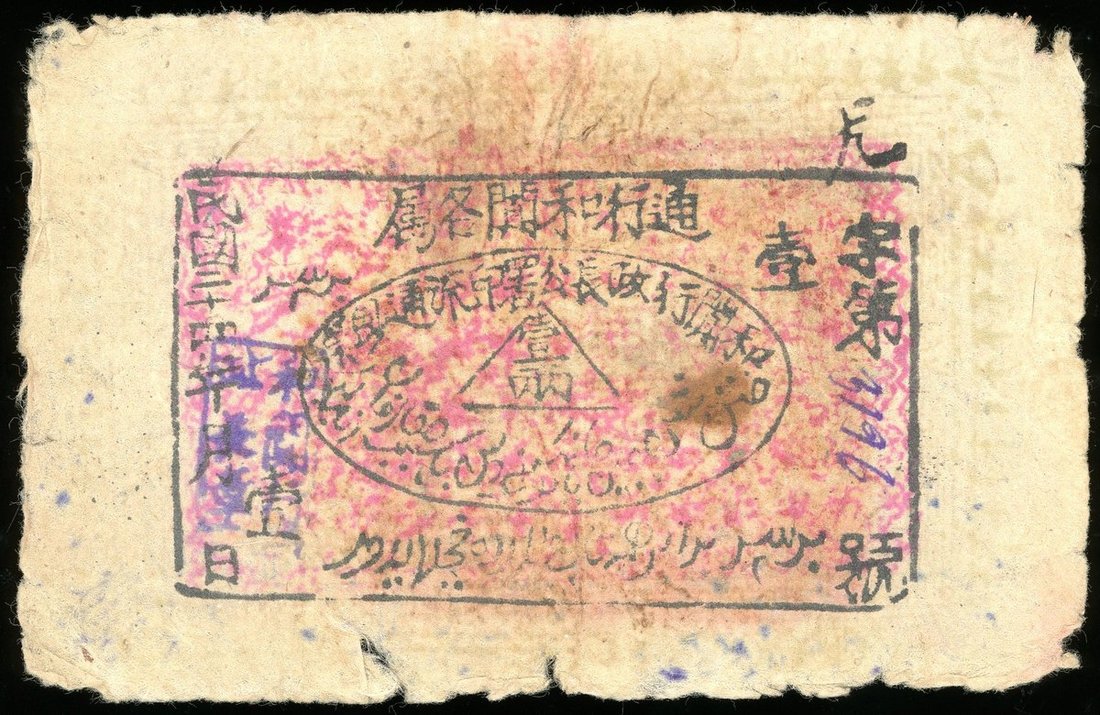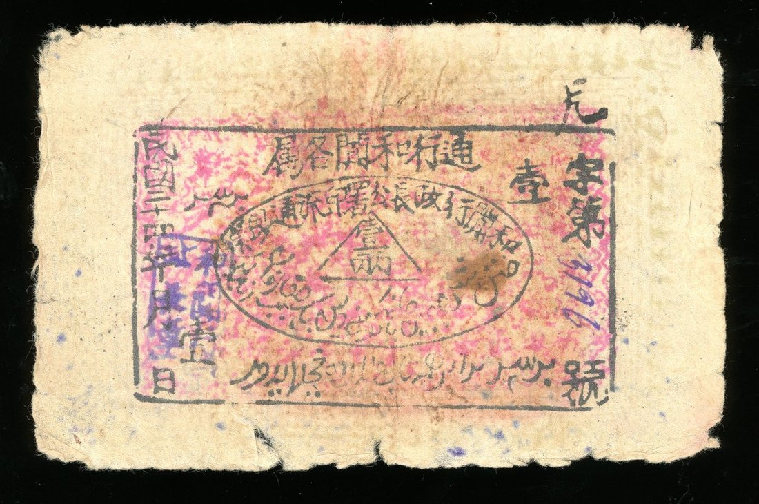 1935年和闐行政長公署印流通券1兩,編號3196,AF品相
