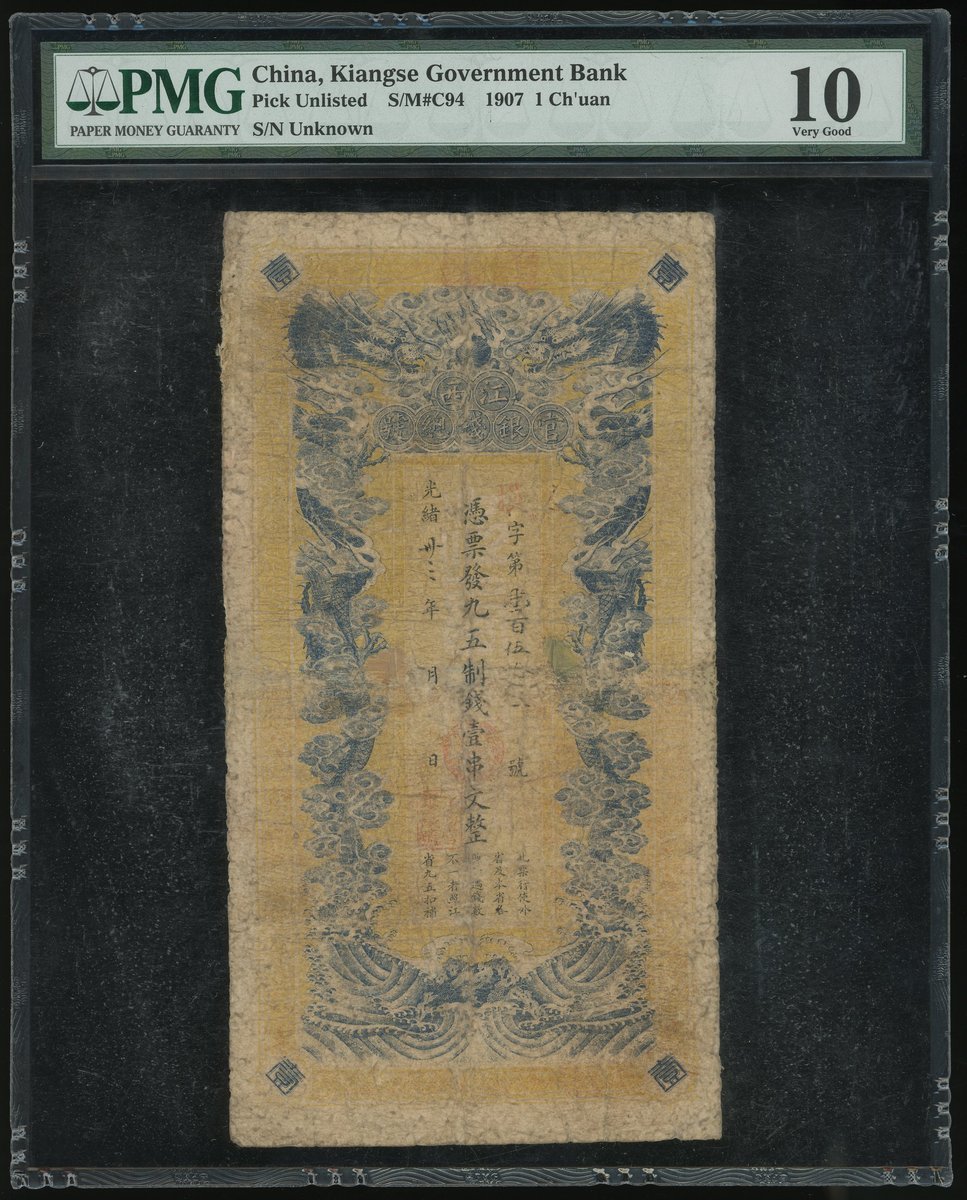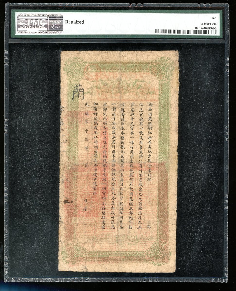 光緒三十三年(1907)江西官銀錢總號1串文,PMG10,有修補