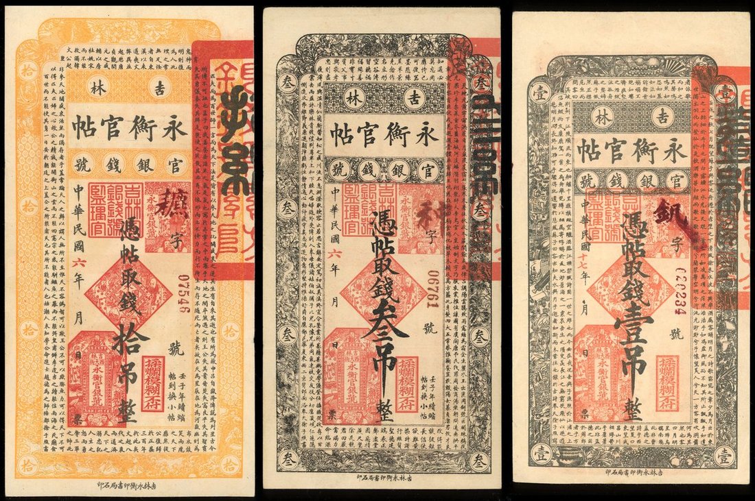 吉林永衡官銀錢號紙幣3枚一組,包括1928年1吊,1917年3吊及10吊,VF至GVF品相
