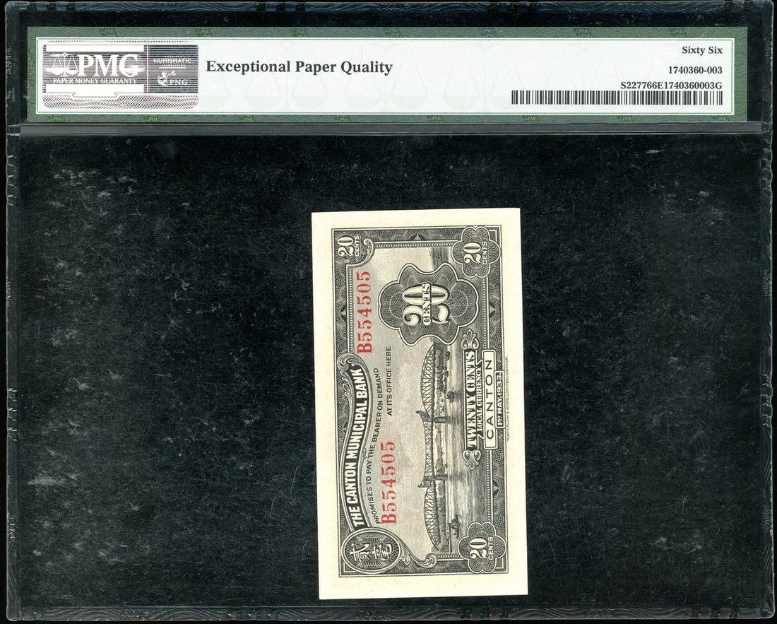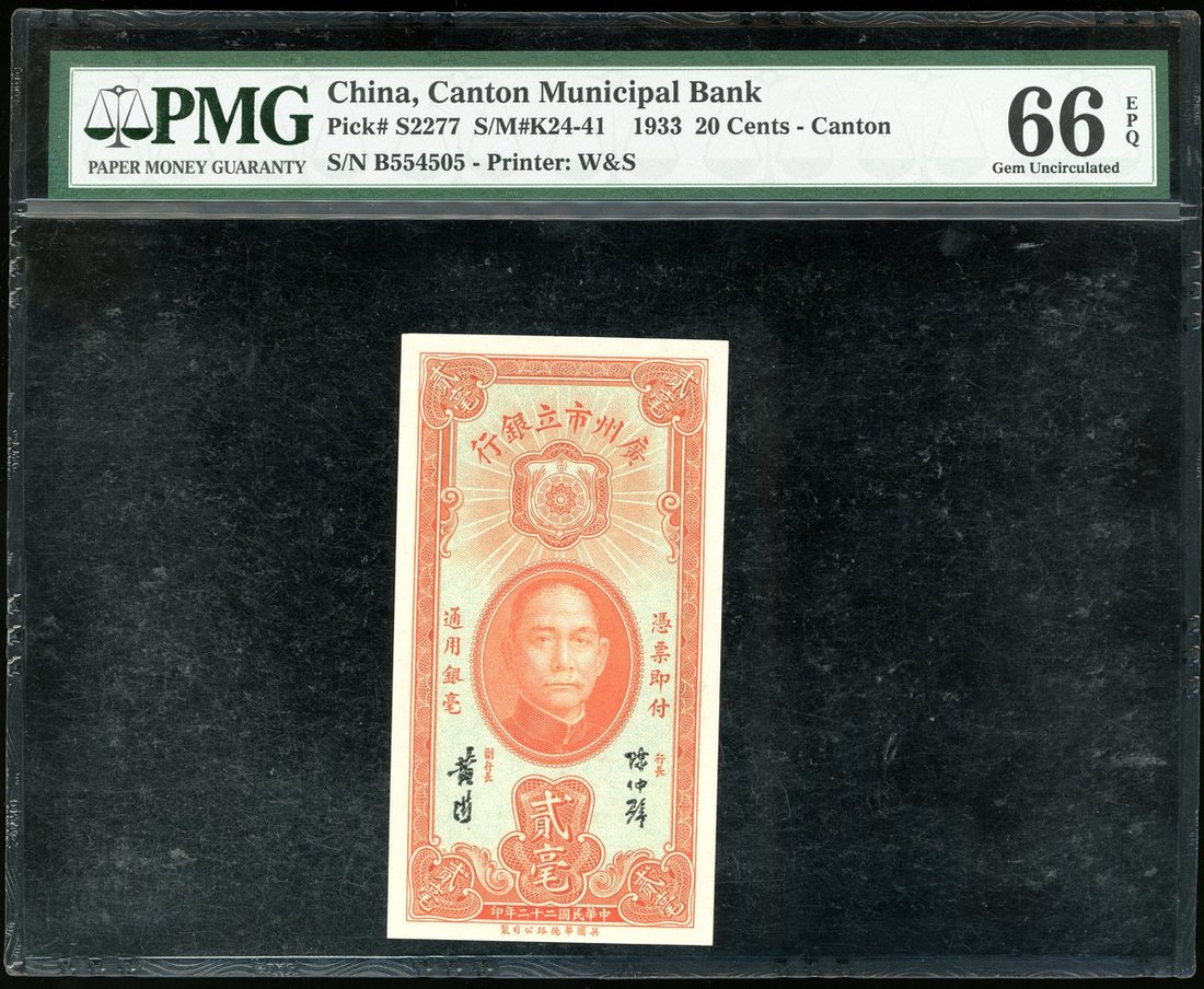 1933年廣州市立銀行2毫,編號B554505,PMG 66EPQ
