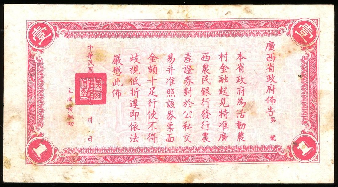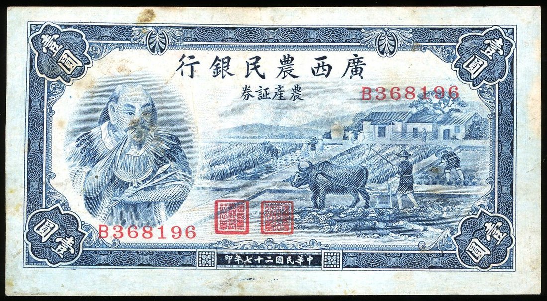 Kwangsi Farmers Bank, 1 yuan, 1938, serial number B368196, (Pick S2295), very fine