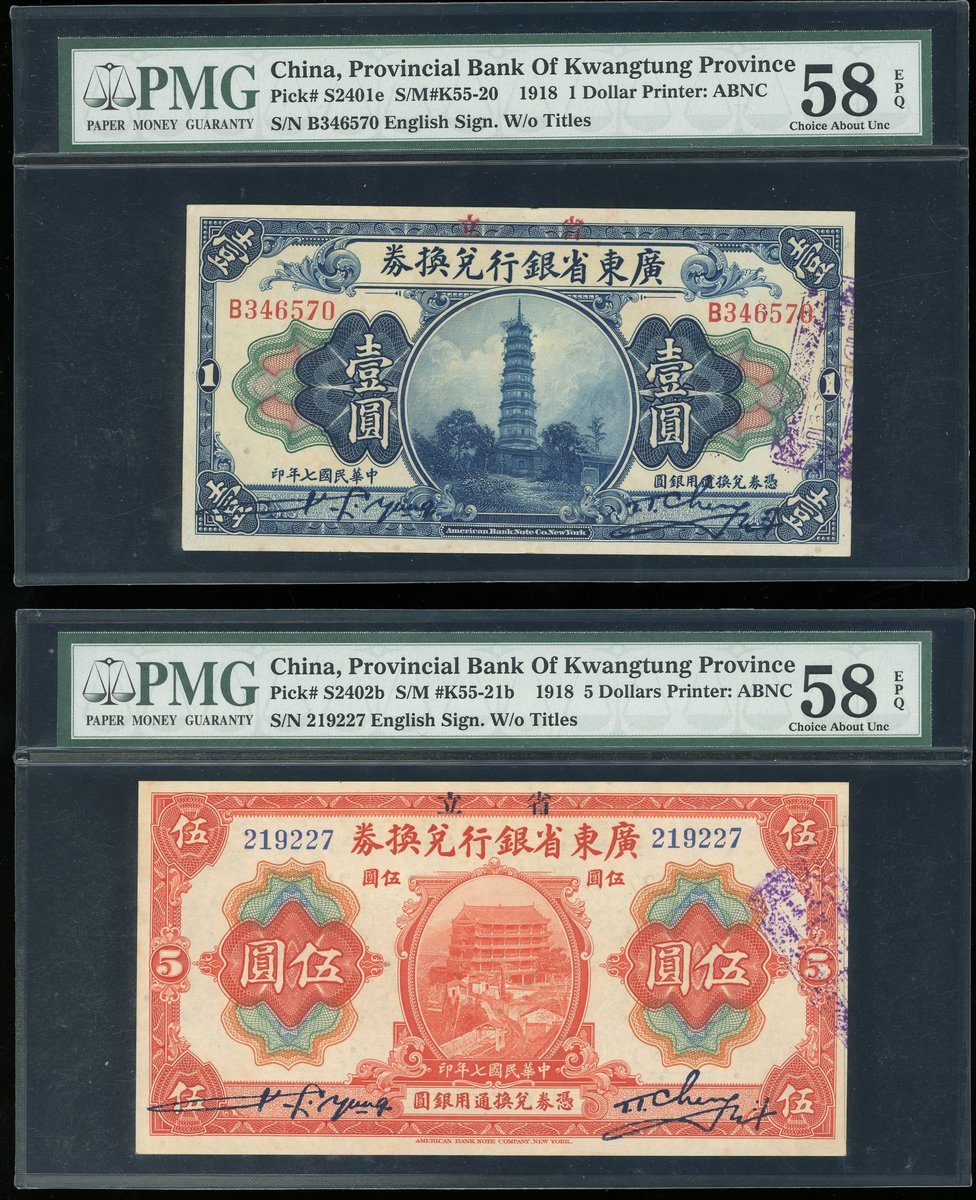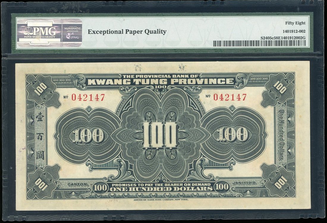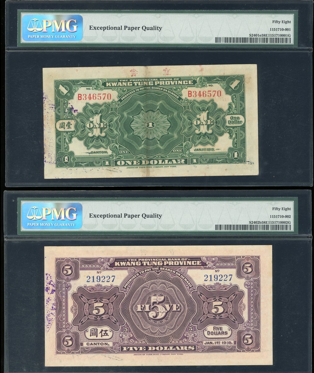 1918年廣東省銀行兌換券一套5枚,面額1元至100元,分別評PMG58EPQ,58EPQ,55,55EPQ及58EPQ
