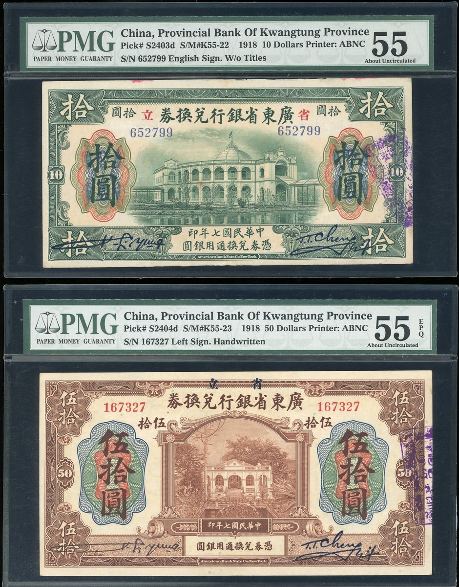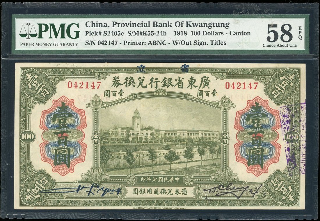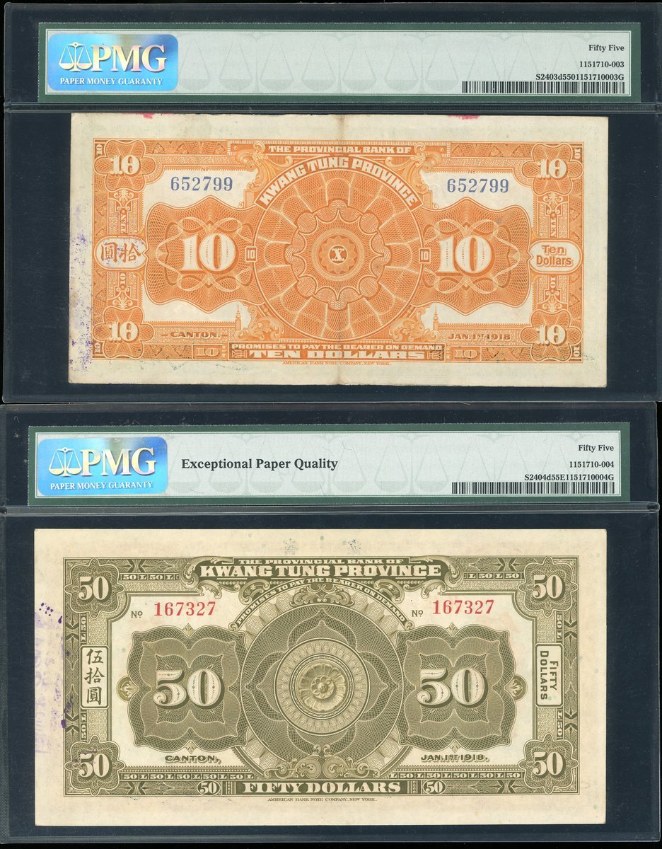 1918年廣東省銀行兌換券一套5枚,面額1元至100元,分別評PMG58EPQ,58EPQ,55,55EPQ及58EPQ