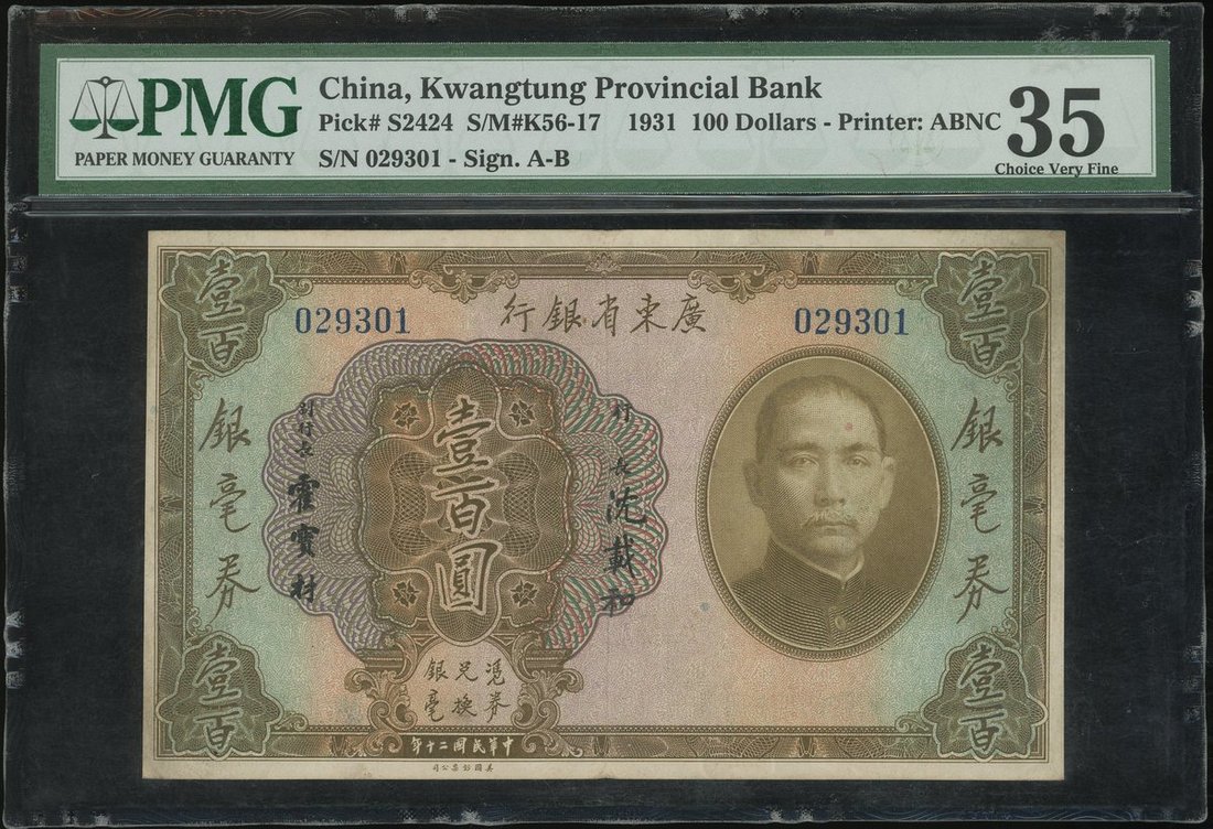 The Kwangtung Provincial Bank, $100, 1931, serial number 029301, (Pick S2424), PMG 35 Choice Very Fine (Annotation) and the largest denomination of this series