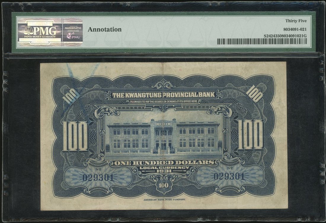 1931年廣東省銀行銀毫券100元,編號029301,PMG 35有書寫,乃是此系列最高面值的鈔票