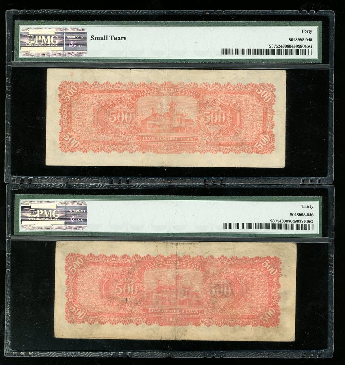 1947年東北銀行500元2枚,不同版別的毛澤東像圖案,編號(MP)259784及JR323687,分別評PMG40(微裂)及30