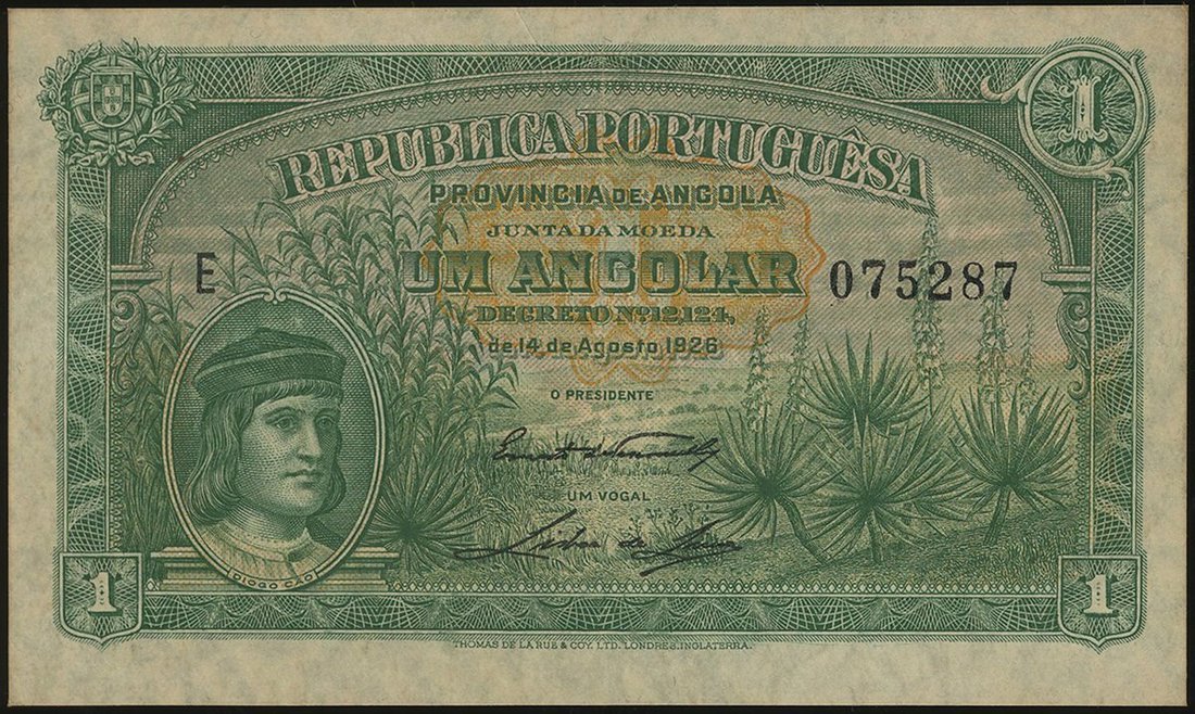 Angola, 1 angolar, 1926, serial number 075287, green and yellow underprint,