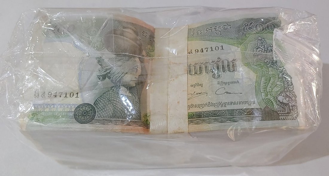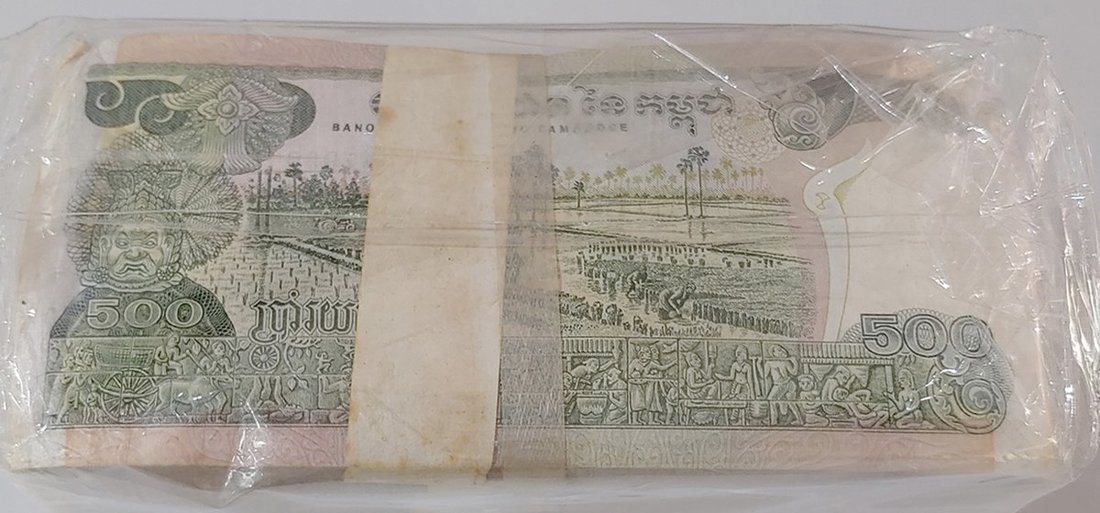 Cambodia, a large bundle of 1000x 500 Riels in 10 bundles of 100 notes, ND (1973-1975), (Pick 16), uncirculated with foxing.(1000)