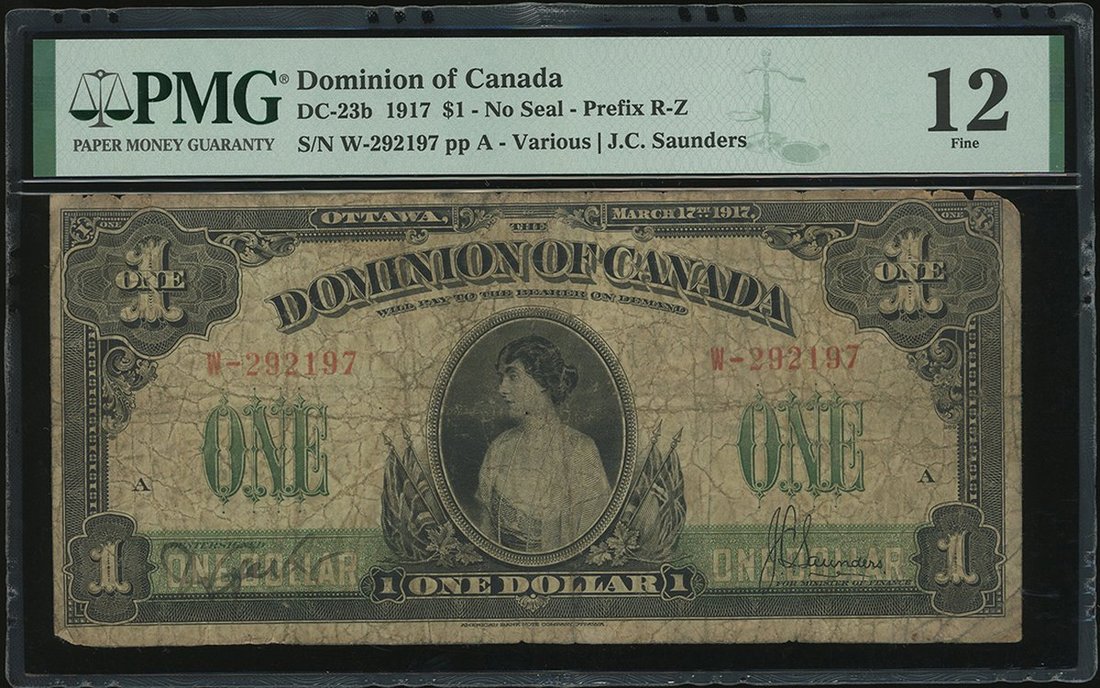 Canada, $1, 1917, serial number W-292197, printed signature of J.C. Saunders at lower right,
