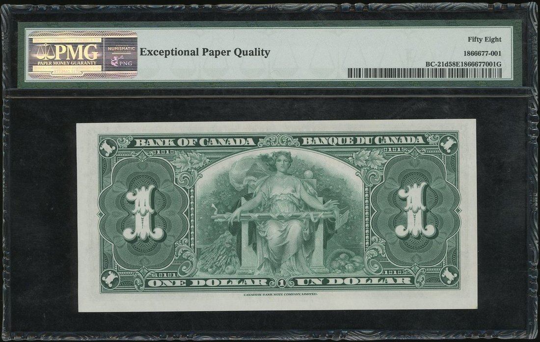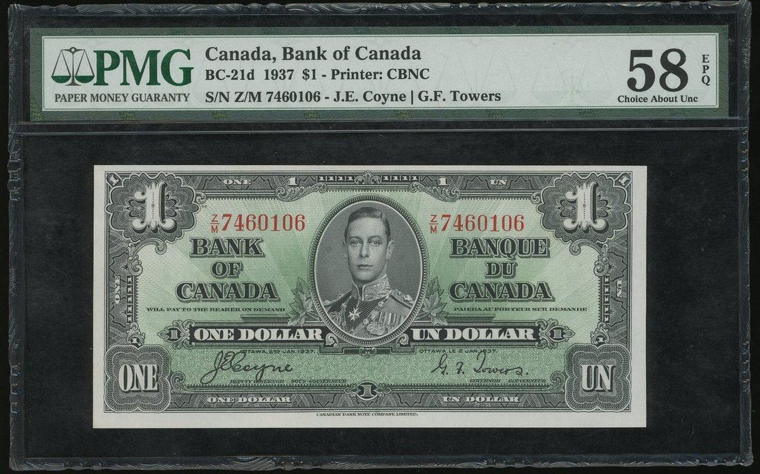 1937年加拿大1元,編號 Z/M 7460106,PMG 58EPQ