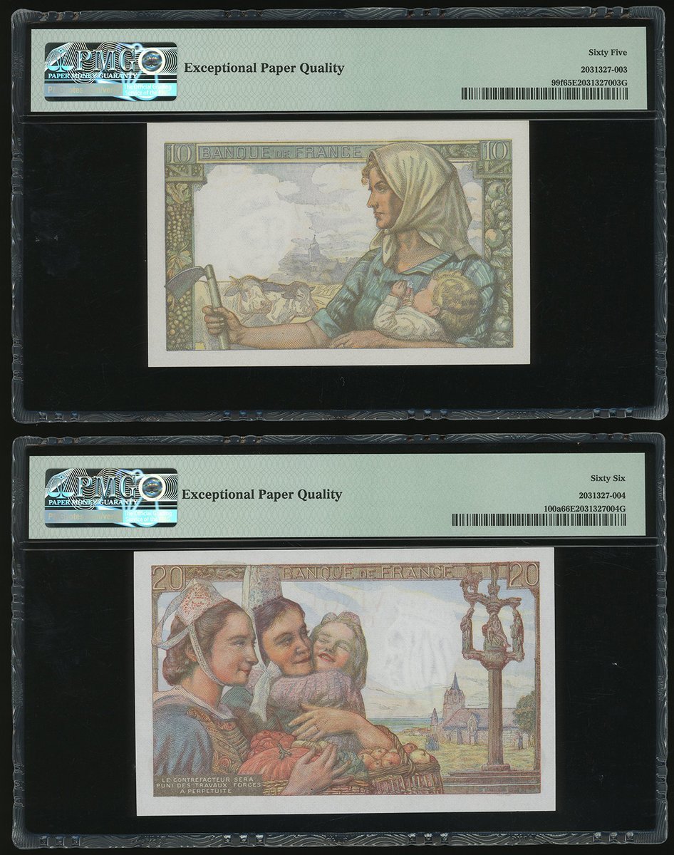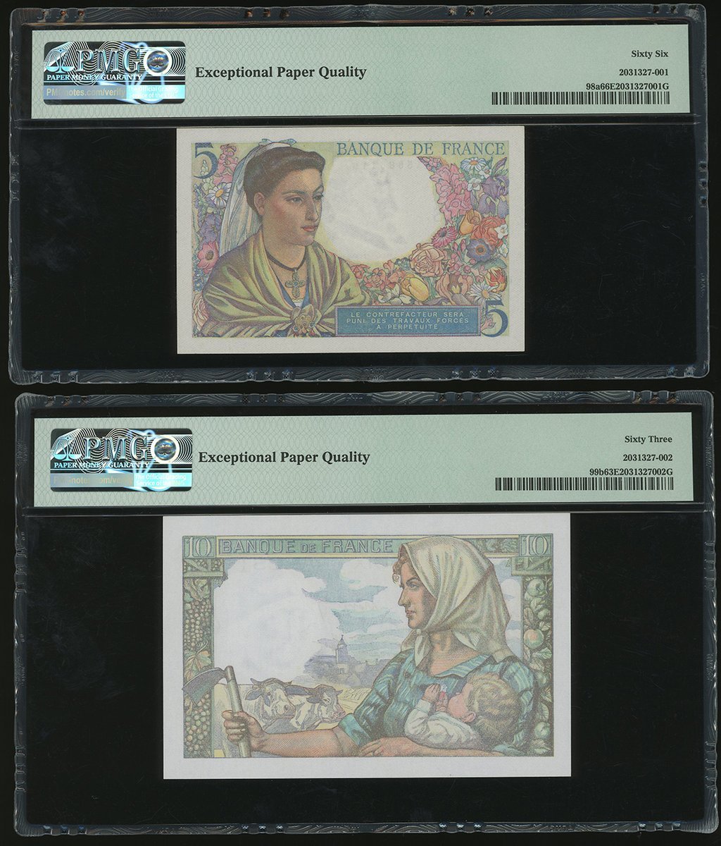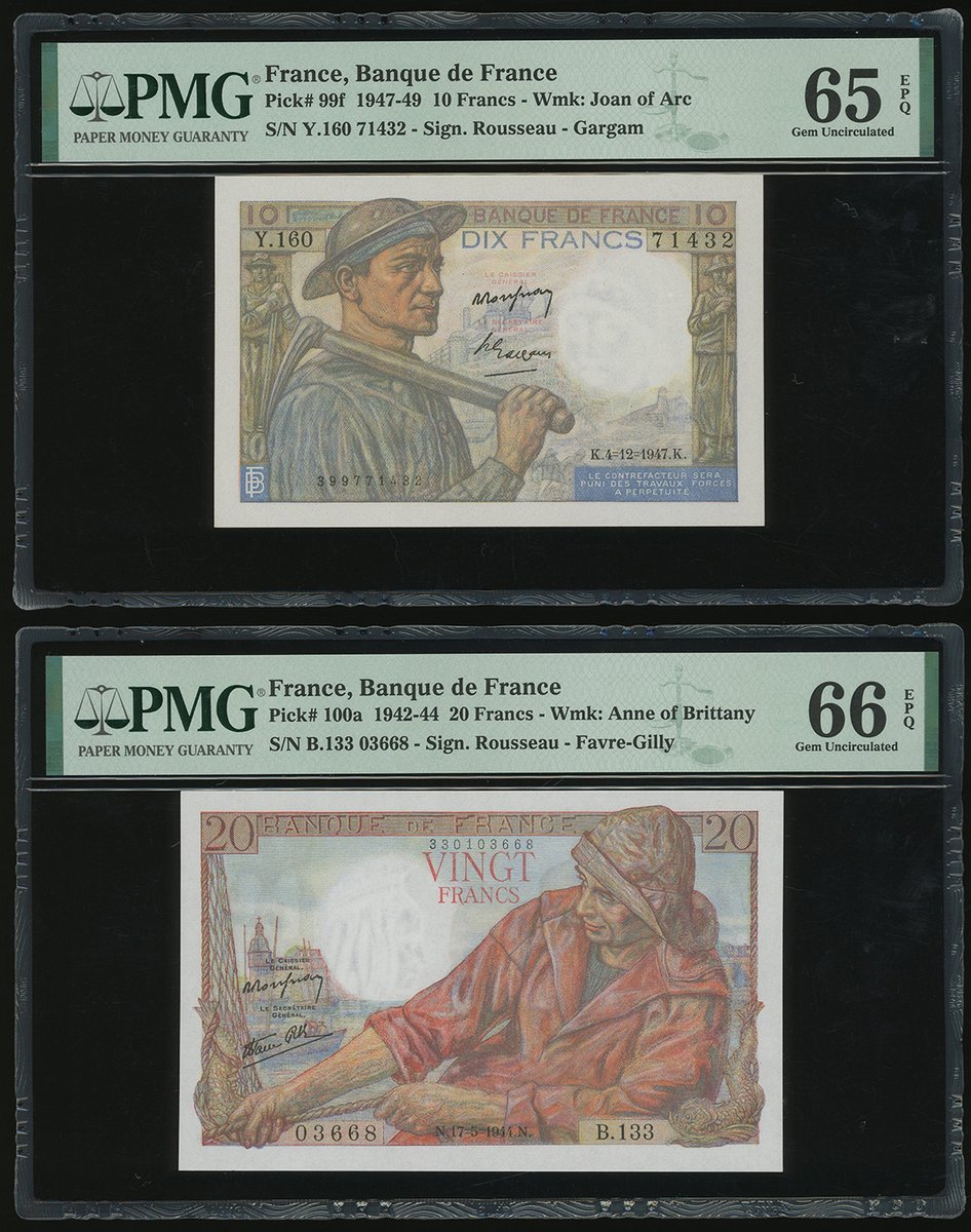 法國銀行一組4枚,包括1945年5元,1942及47年10元,及1944年20元,編號G.127 86119, L.18 14415, Y.160 71432及 B.133 03668,分別評PMG 66EPQ, 63EPQ, 65EPQ 及 66EPQ