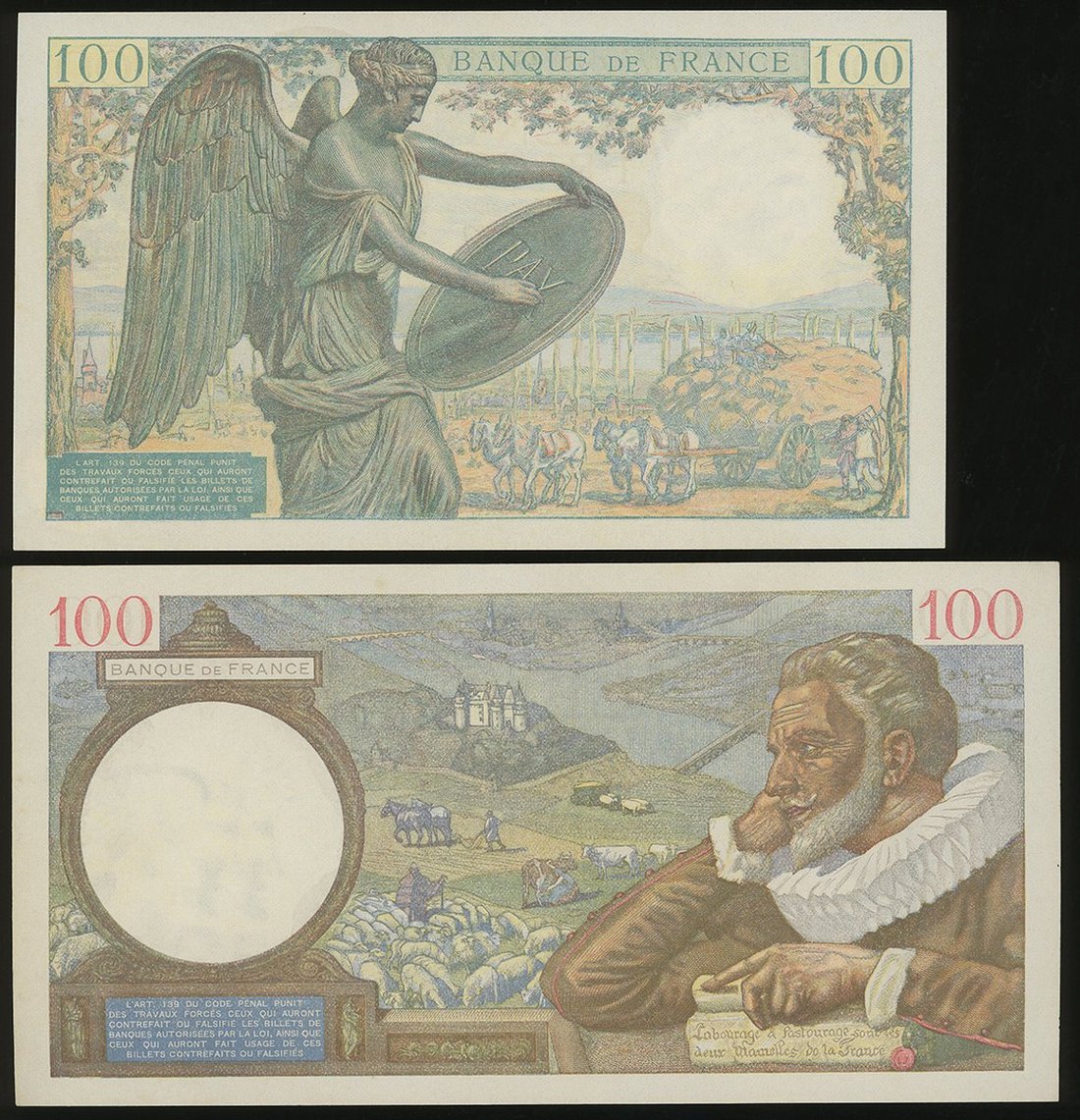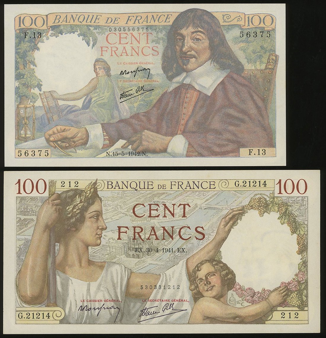 Banque de France, 2x 100 Francs, 30.4.1941 and 15.5.1942, serial numbers G.21214 212 and F.13 56375, (Pick 94, 101a), with light folds, about uncirculated (2)