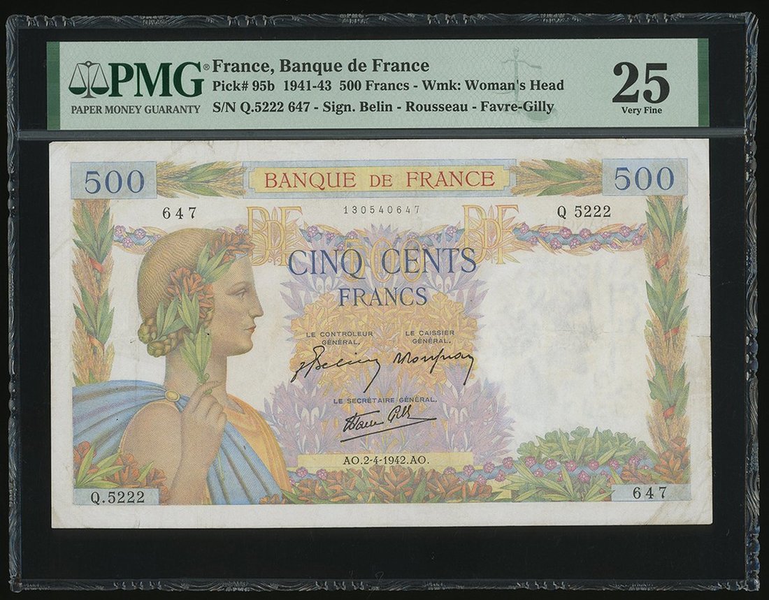Banque De France, 500 Francs, 2.4.1942, serial number Q.5222 647, (Pick 95b), PMG 25 Very Fine (Pinholes)
