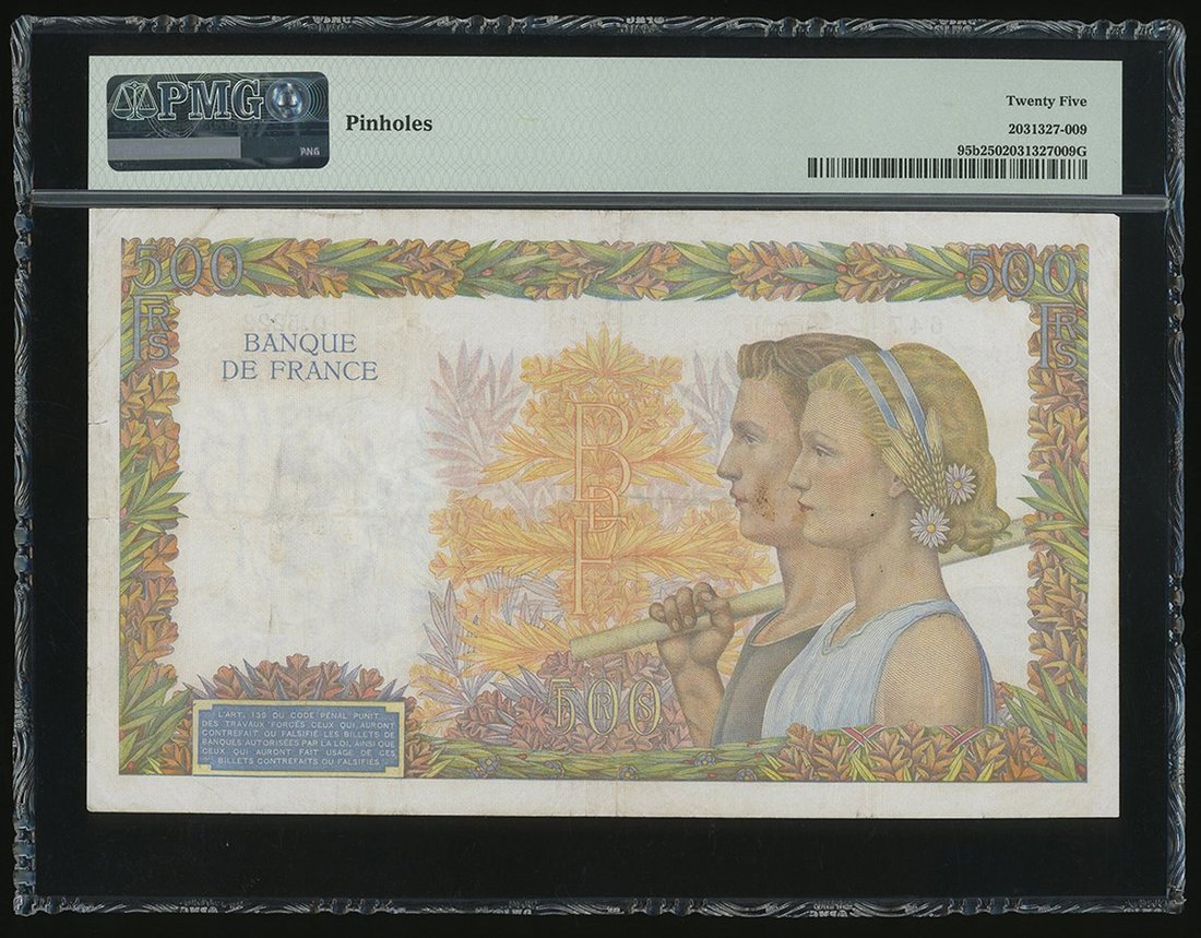 1941年法國銀行500法郎,編號Q.5222 647,PMG 25,有細孔