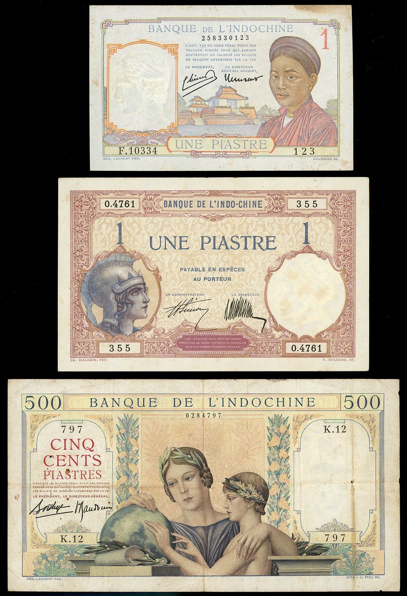 French Indo China, group of 3 notes, 1 piastre, 2 types and 500 piastres from 1939 or so,