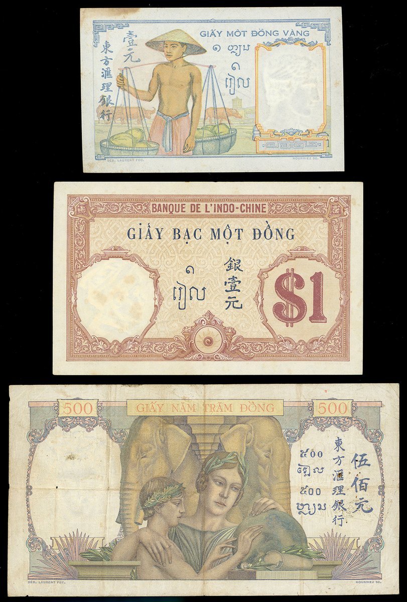 法屬安南紙鈔一組3枚,1元2枚,及1939年500元,