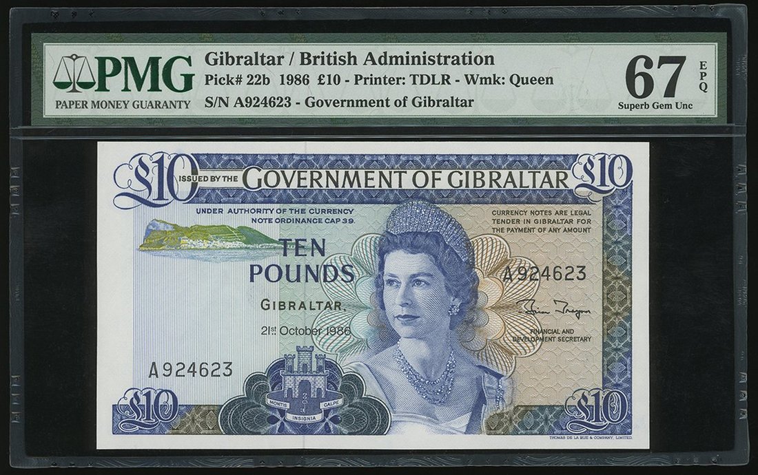 Government of Gibraltar, £10, 21.10.1986, serial number A924623, (Pick 22b), PMG 67EPQ Superb Gem Uncirculated