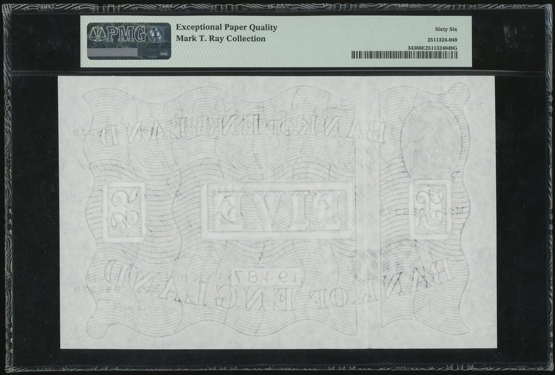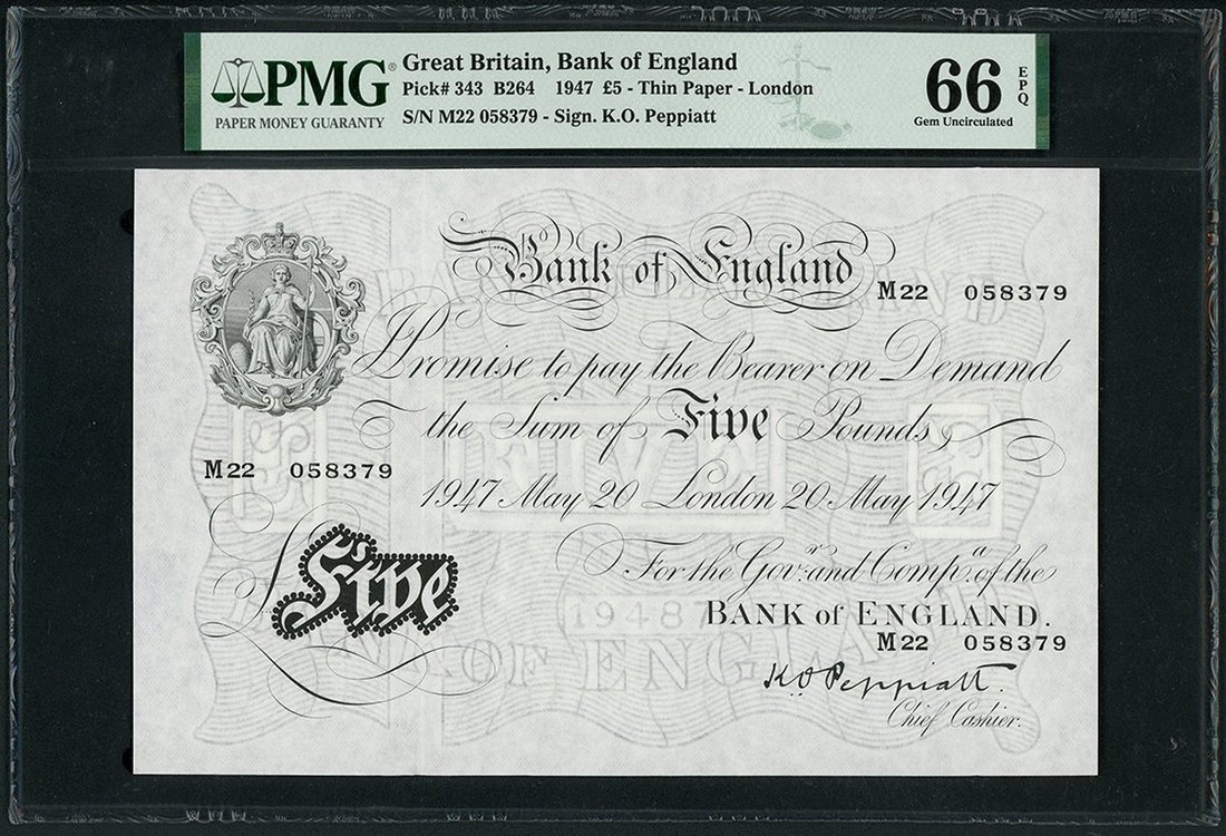 1947年英倫銀行5鎊,編號M22 058379,PMG 66EPQ,大熱版別,EPQ級別更見罕有