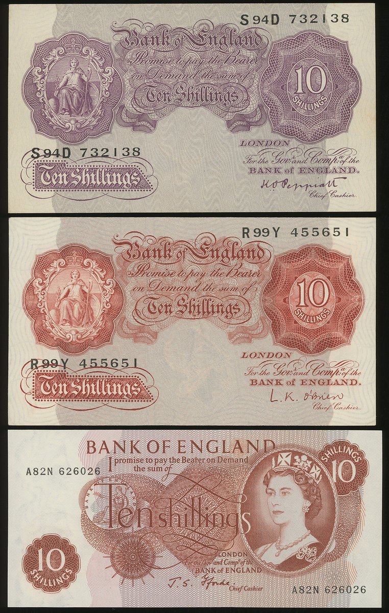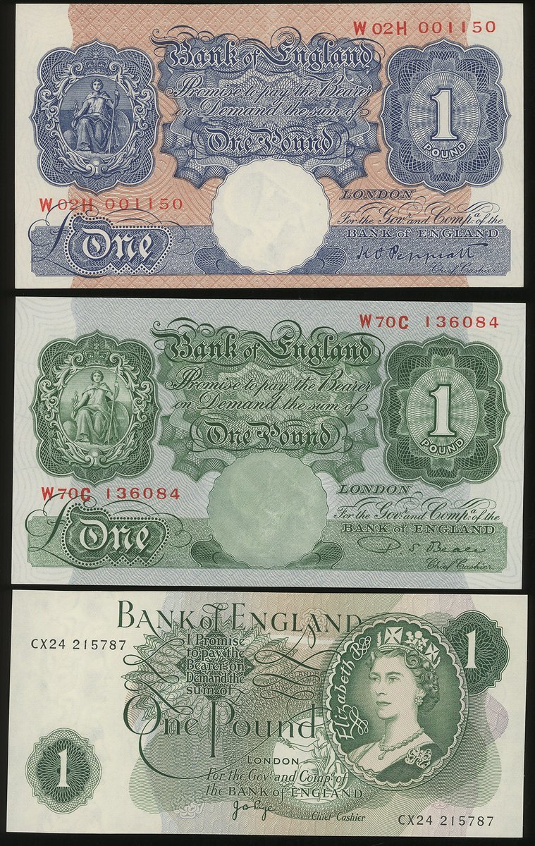 Bank of England, group of 6, consisting of 3x 10 shillings, ND (1940-48, 1955-60, 1966-70) and 3x £1, ND (1940-48, 1949-55, 1970-77) (Pick 366, 368c, 373c, 367a, 369b, 374g), the purple 10 shillings extremely fine, the rest uncirculated (6)