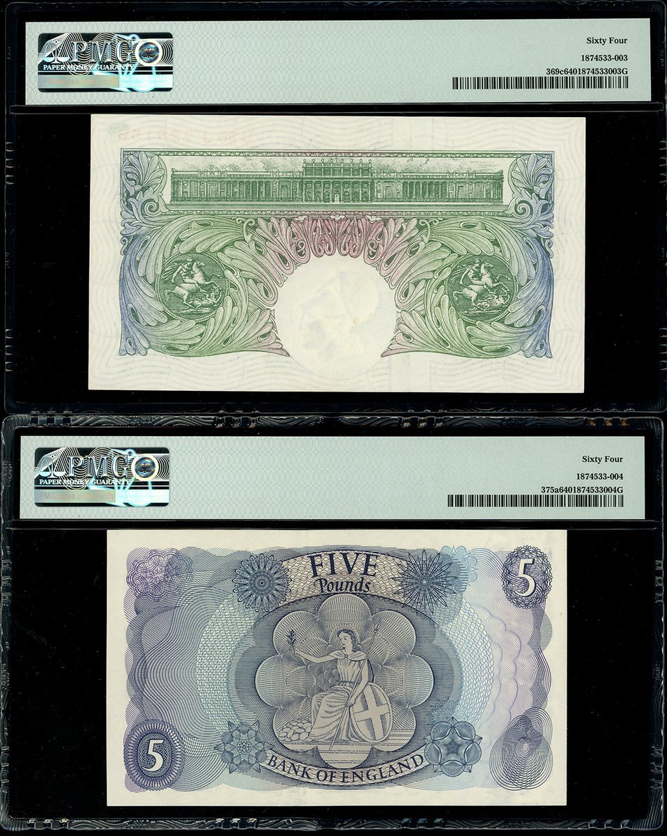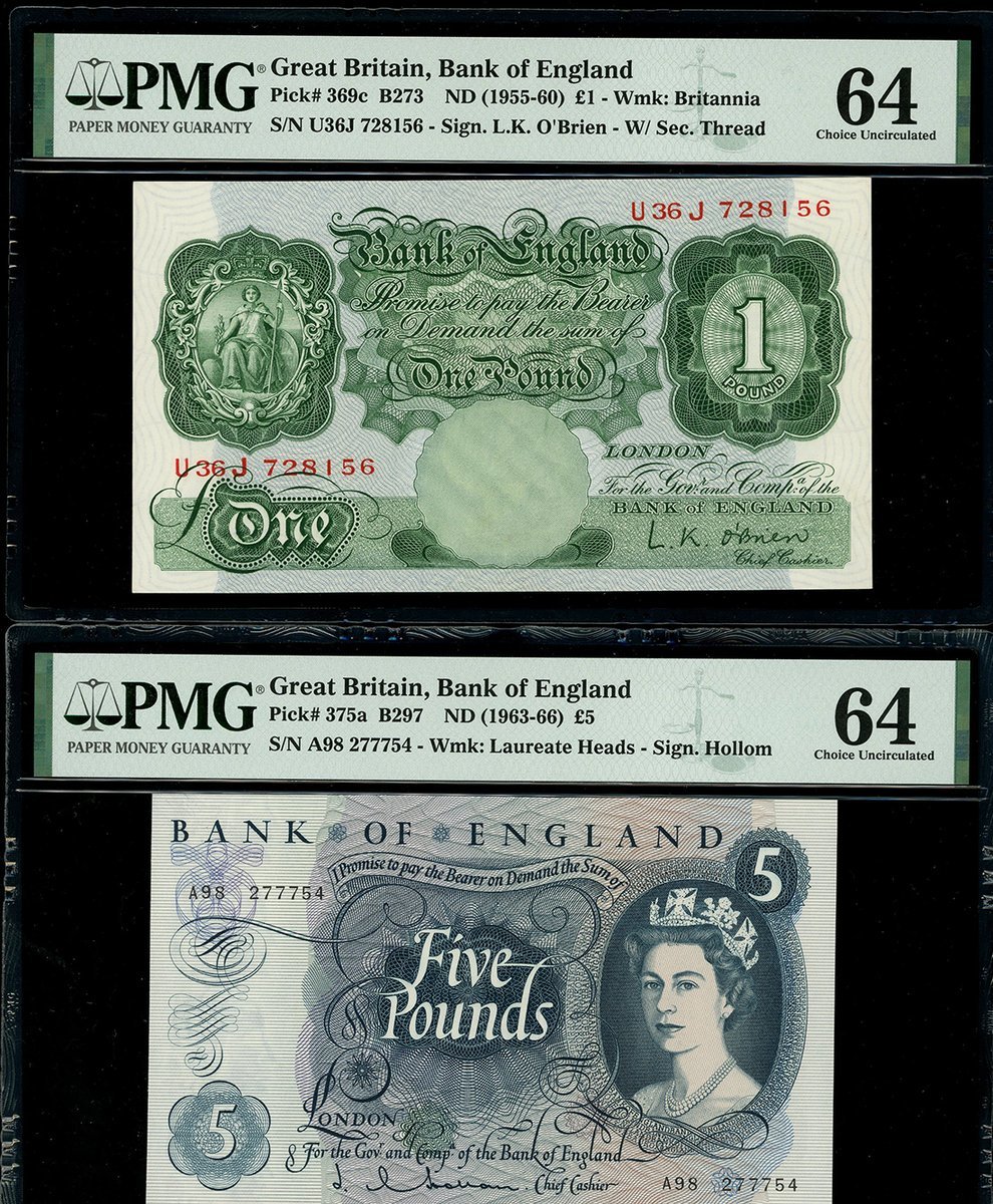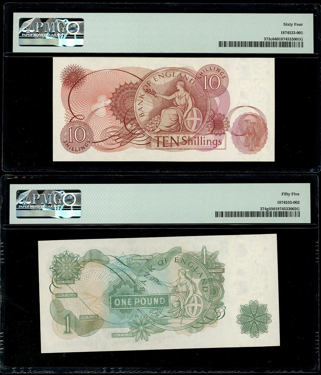 英倫銀行一組4枚,包括10先令1枚, 1鎊2枚及5鎊1枚,編號 C26N 347390, EX28 746175, U36J 728156, A98 277754,其中一枚評PMG 55,其餘評64